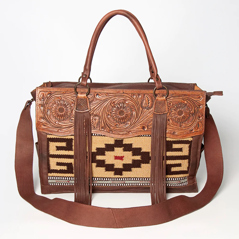 A hand weaved woolen saddle blanket gives the bag a western traditional yet trendy and elegant look. Genuine Full Grain Leather is used for the bag. It’s a Soft and supple leather that ages beautifully as it wears. The bag is decorated with a beautiful leather fringe giving it a western look. Made with an enticing combination of hand-tooled vegetable tanned cowhide leather, this bag delivers an amazing fashion statement.