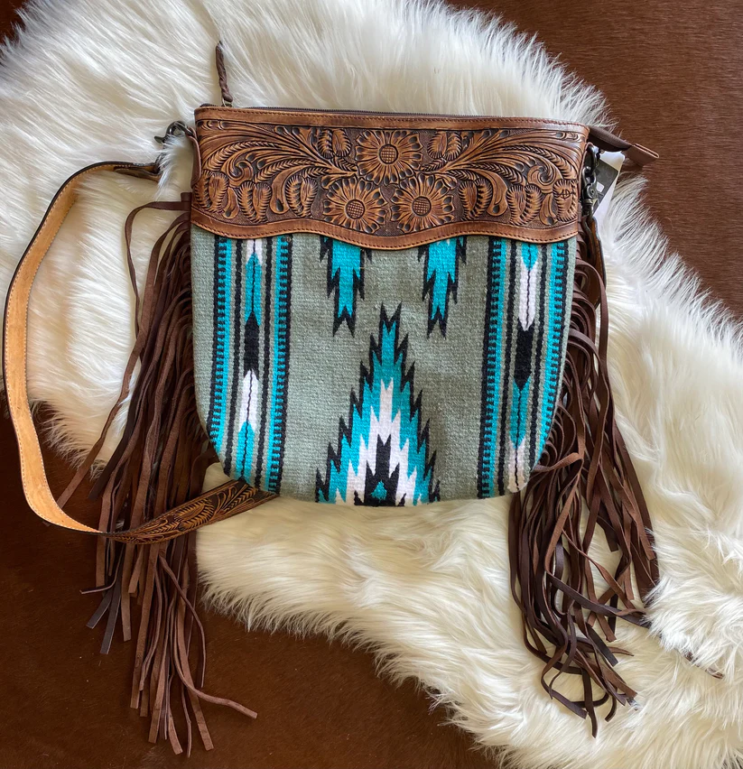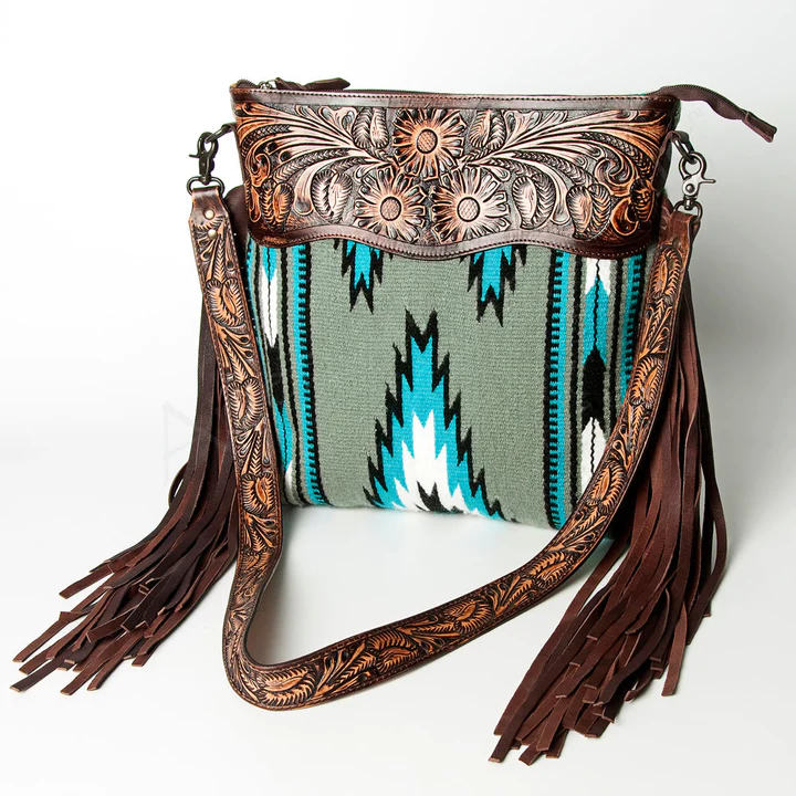 The hand weaved woolen saddle blanket gives the bag a western traditional yet trendy and elegant look. Made with an enticing combination of hand-tooled vegetable tanned cowhide leather, this crossbody bag delivers an amazing fashion statement.The crossbody bag is decorated with a beautiful leather fringe on each side giving it a western look.