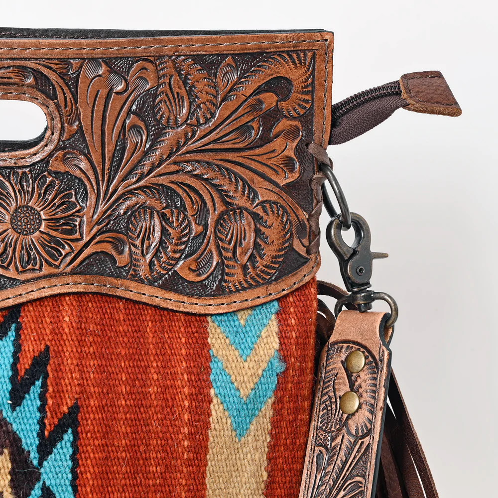 A hand weaved woolen saddle blanket gives the bag a western traditional yet trendy and elegant look. The bag is decorated with a beautiful leather fringe giving it a western look. Tooled and painted Leather is a vegetable tanned Cowhide Leather with nature-inspired engravings.
