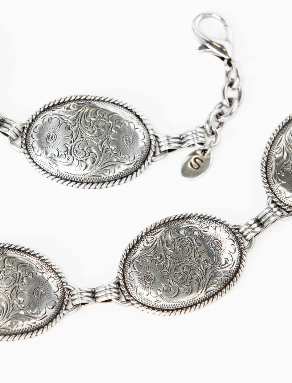 Engraved with subtly Southwestern flowers, this concho-inspired belt has a Boho feel that is both sophisticated and effortless. This Oval Concho Chain Belt from Tony Lama is the perfect accessory to complete that southwestern look. 1.75″ X 1.25″ oval metal conchos with traditional western filigree engraving and twisted rope trim are linked together to form this gorgeous piece. Get the classic look of the southwest with this Tony Lama Concho Belt today.