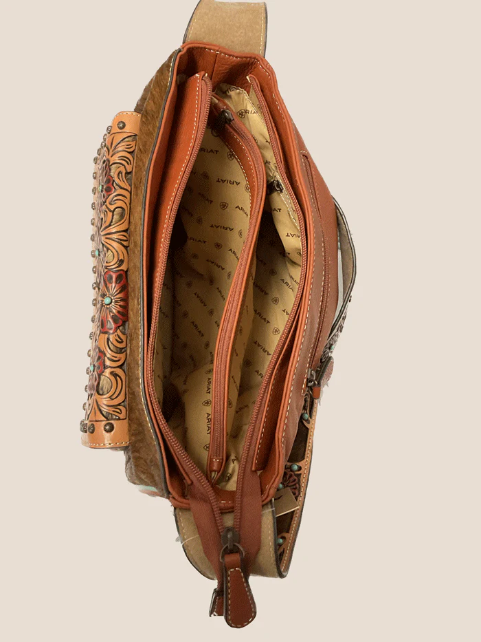 Ariat A770005408 Women’s Lorelei Tote Calf Hair Tooled Tan – Tan genuine leather on side panels with aqua fringe. There is calf hair on the body of the bag with a large pocket on the front with tooled cut out flap in a floral design. The strap has a calf hair inlay with floral tooled cut out design and turquoise stones.
