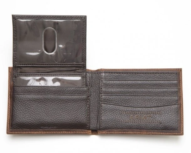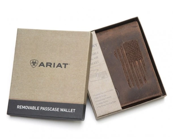 Keep your money and credit cards quick at hand with this Ariat trifold wallet by M&F Western Products. Distressed USA flag stitched on the front with an Ariat shield logo stamped on bottom corner. It features multiple compartments for your credit cards, cash, and an ID window.