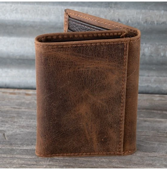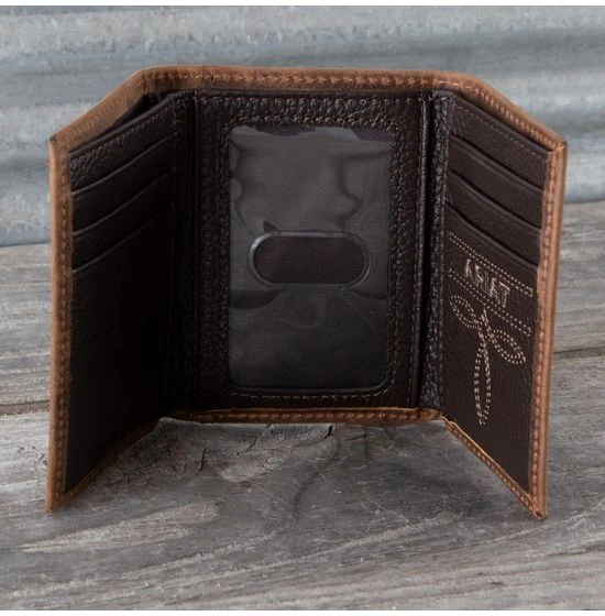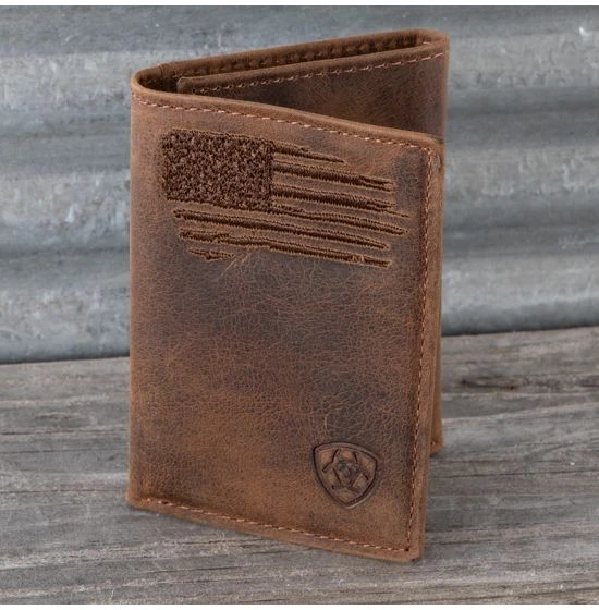 The Ariat Flag Brown Trifold Wallet is the perfect one for you with the multiple compartments and the embroidered flag detailing. The patriotic flag, multiple card slots, ID window, quality construction, this wallet has it all packed into a compact trifold design. The flag design on the top grain distressed leather gives this trifold a perfect patriotic edge over other wallets.