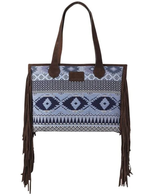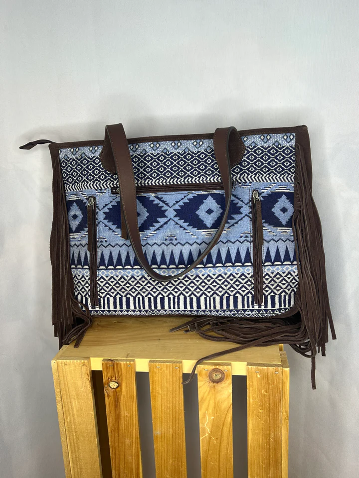 Ariat Madison wide tote by M&F Western Products. Bright blue southwestern woven pattern with suede fringe on the sides. Gun pocket on the back with left and right hand access. Top zip closure to keep your belongings safe.