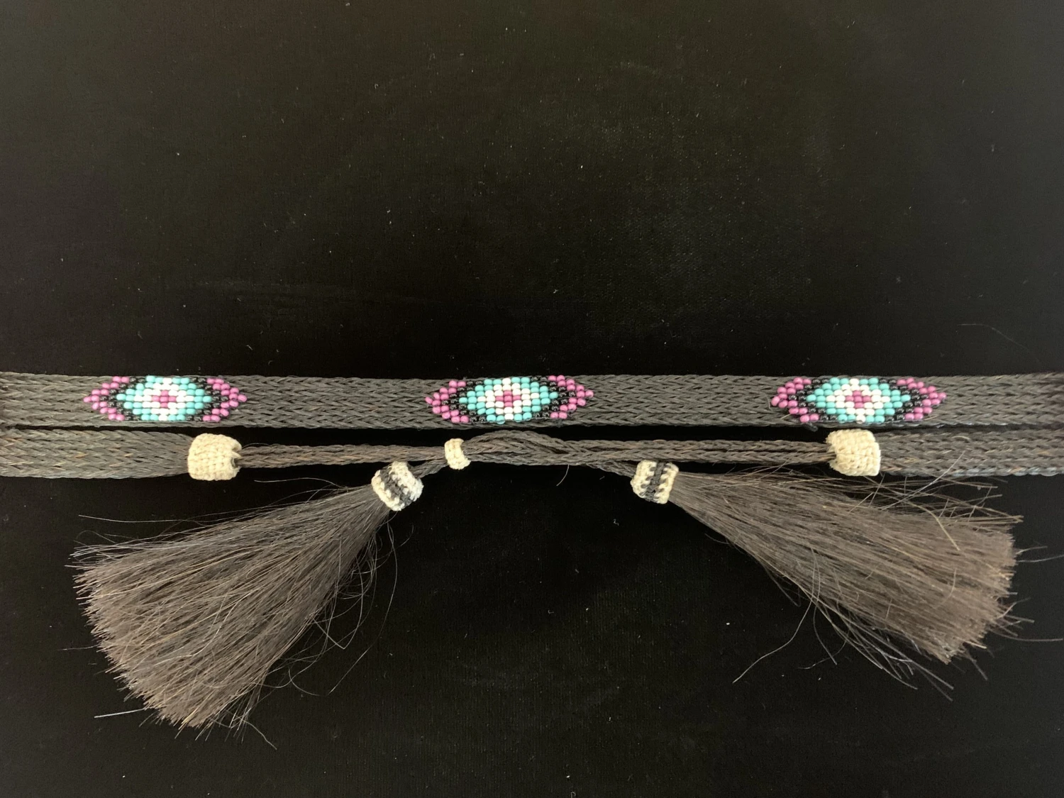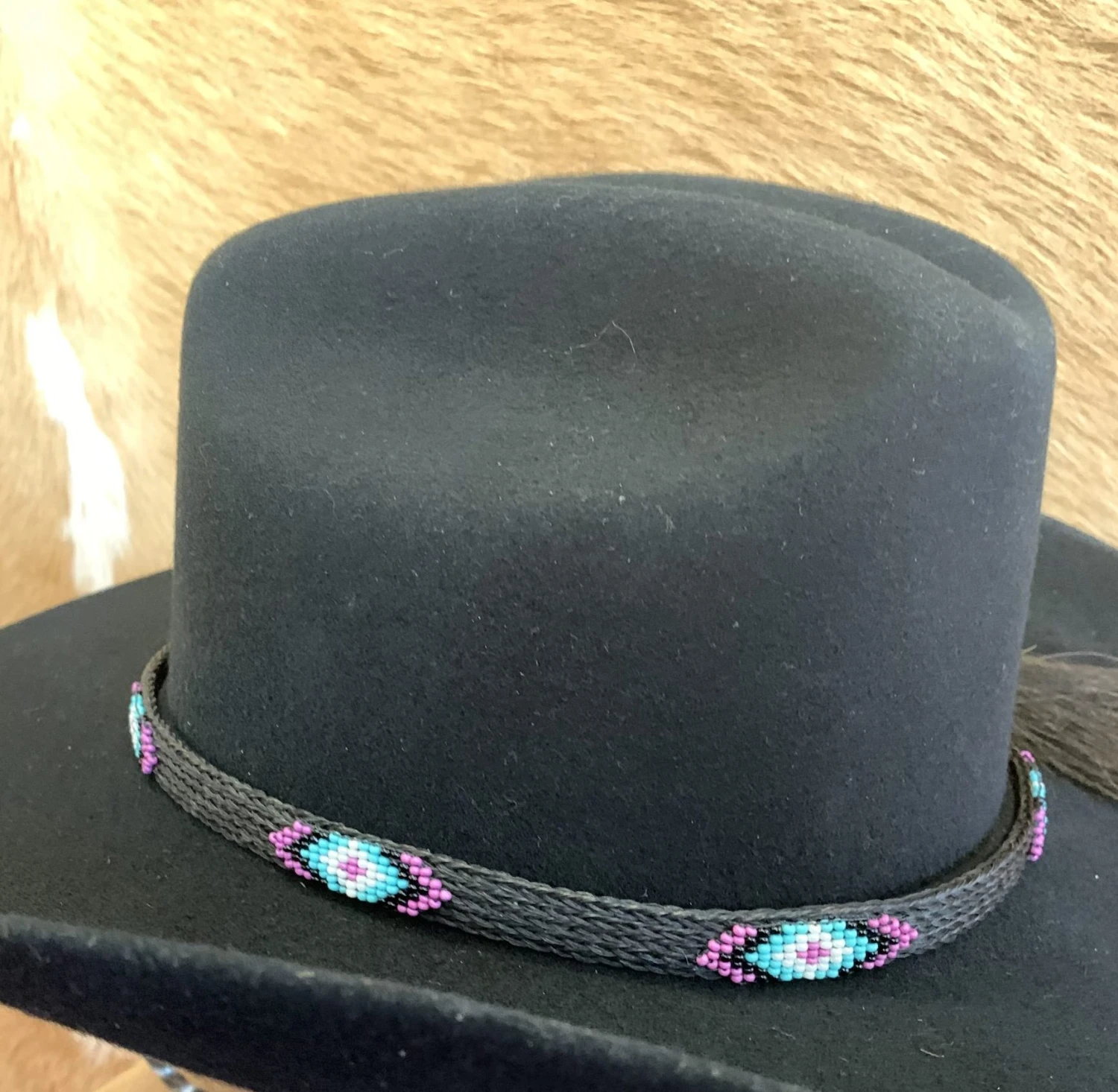 With this Southwest designed beaded Horsehair hat band, You will find yourself being dazzled! Amazing beaded horsehair hat band from Knot-a-Tail. Take a look at this stunning purple and turquoise beaded hat band. The seed beads colors are deep and rich in purple/turquoise/black on a stunning black horsehair. This beauty has two horsehair tassels that are adjustable to most hat sizes. A true stunning hat band that will book extremely distinctive on all of your cowboy hat. This is a real winner, so don’t pass this one buy!