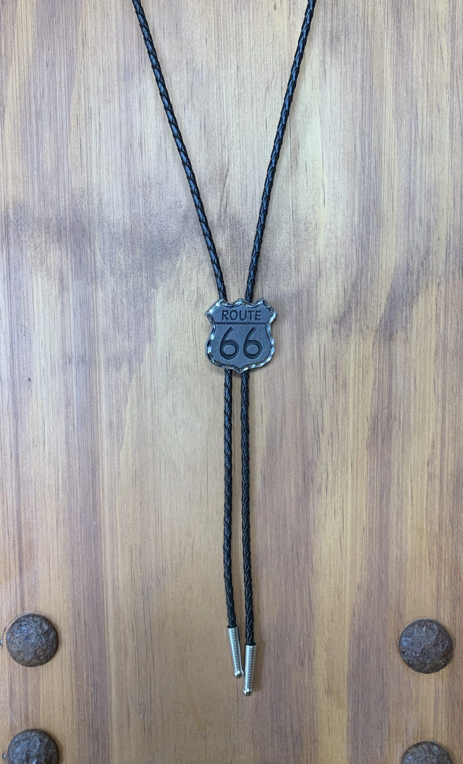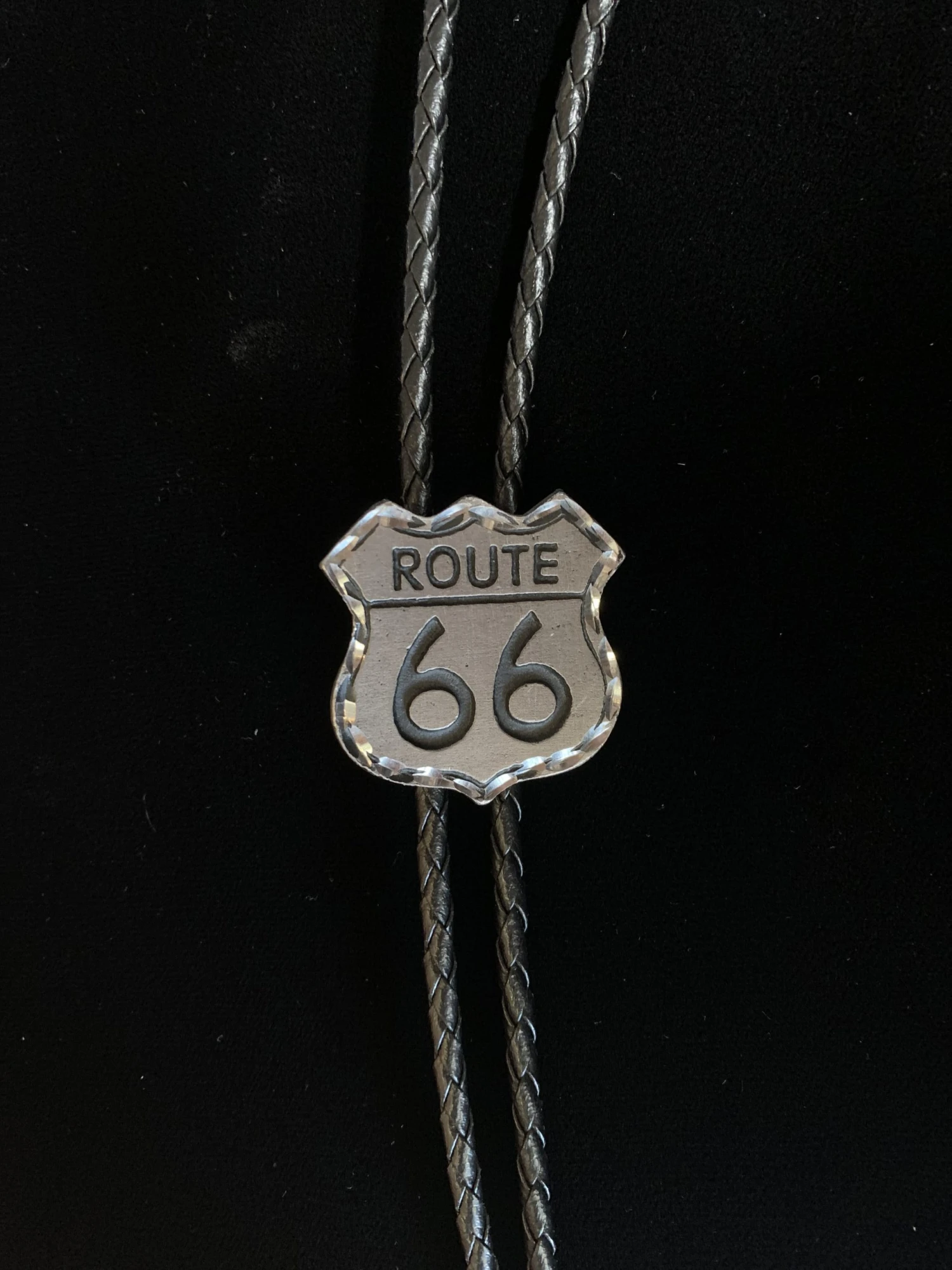 Vintage style route 66 sign setting on a black leather lanyard. This bolo will add western charm to your wardrobe. Our western bolo tie will be the exact finishing touch your western fashion needs! This Bolo Tie is the ultimate in a southwest accessory. Great gift for any birthdays, holiday seasons, anniversaries, and so much more.