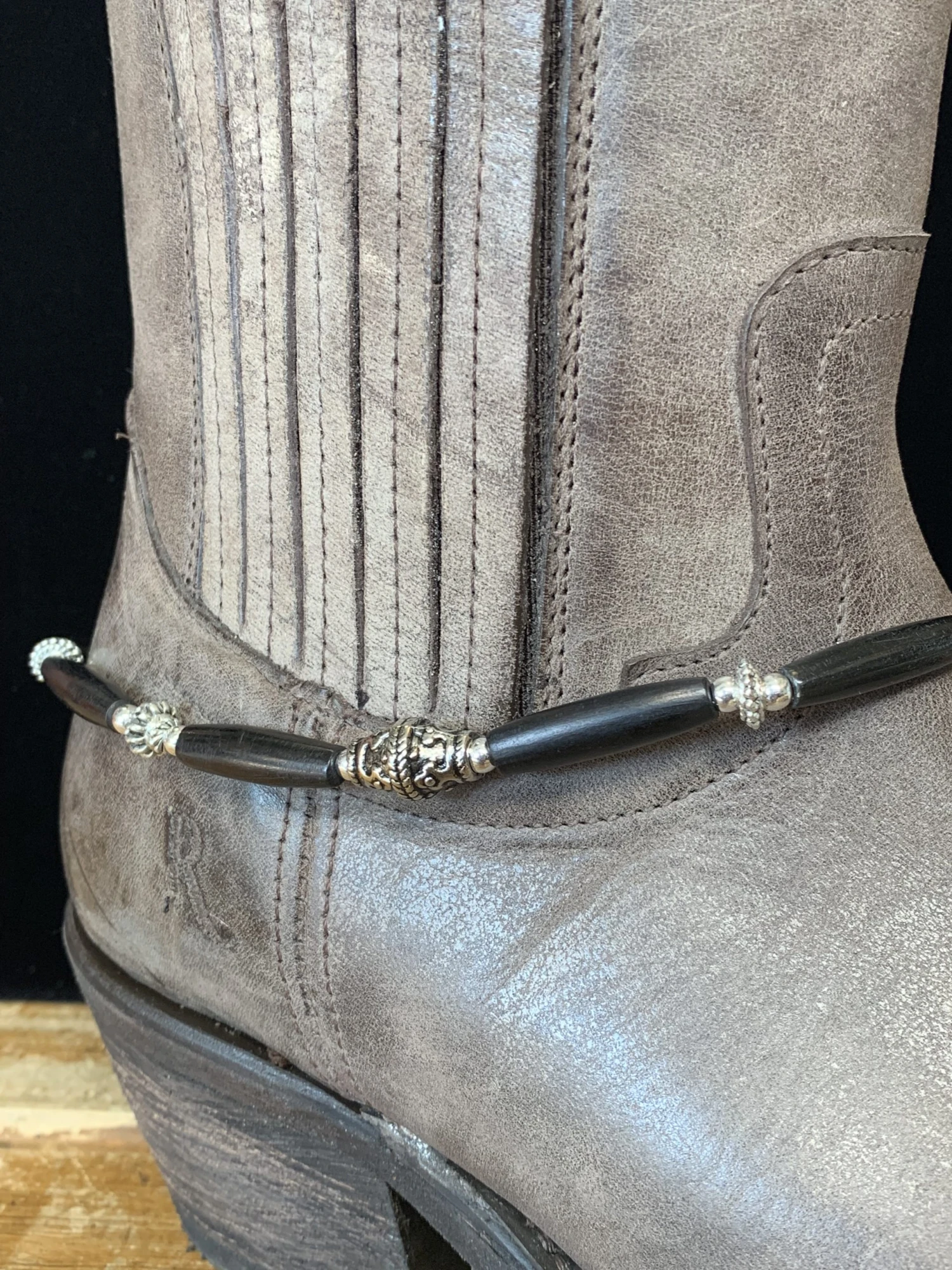This piece features gorgeous accented beads in between the bone tube beads! Strung on sterling silver wire, this Austin Accent boot bracelet is a wonderful piece, with black tube beads forming the perfect accent to the silver beads.