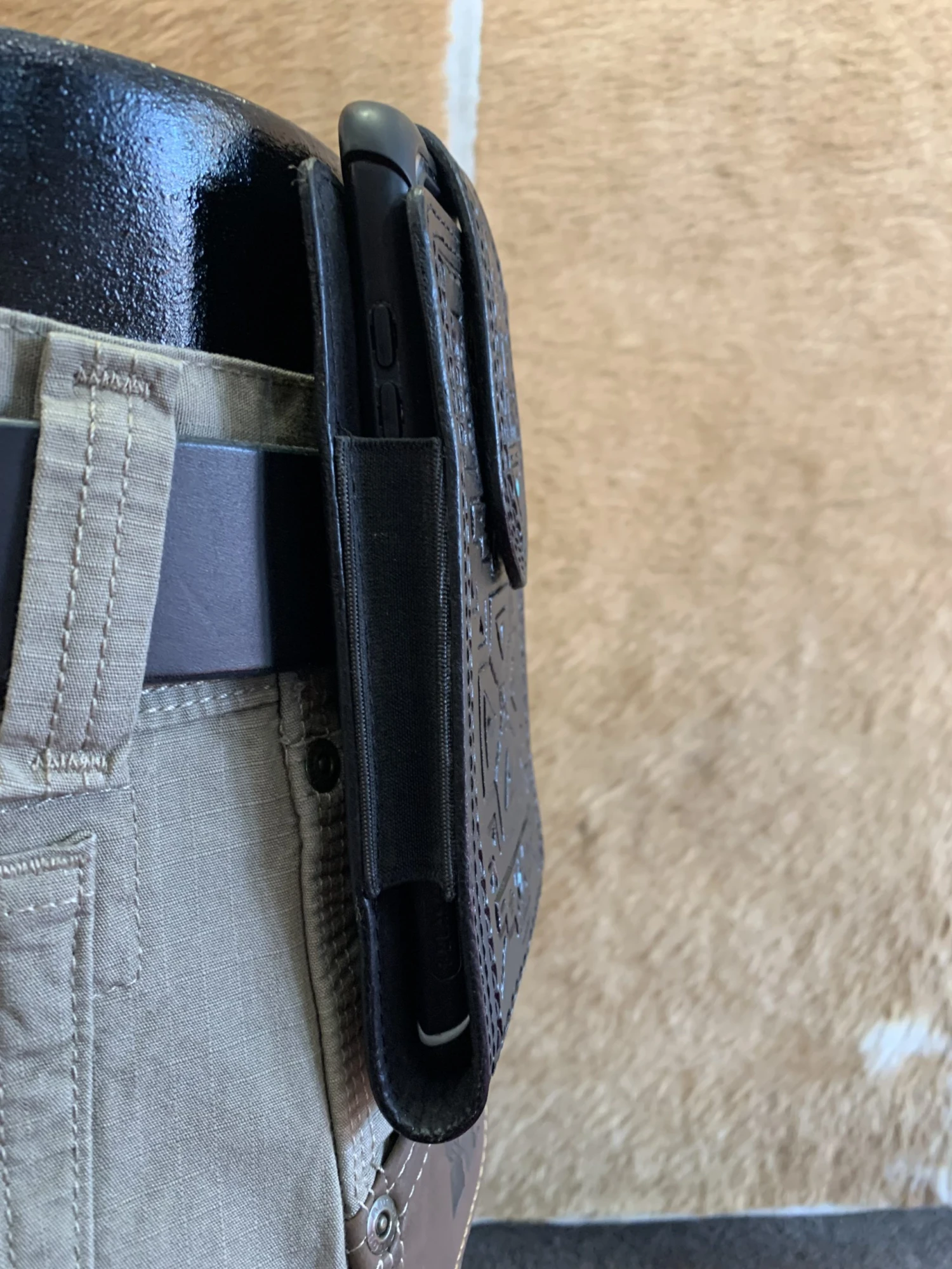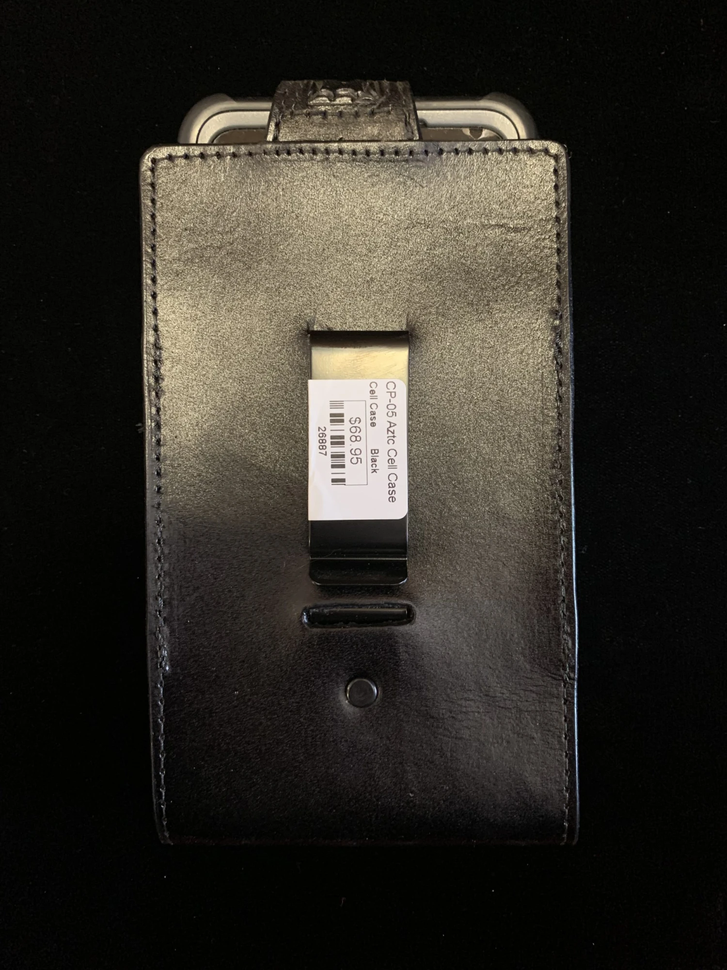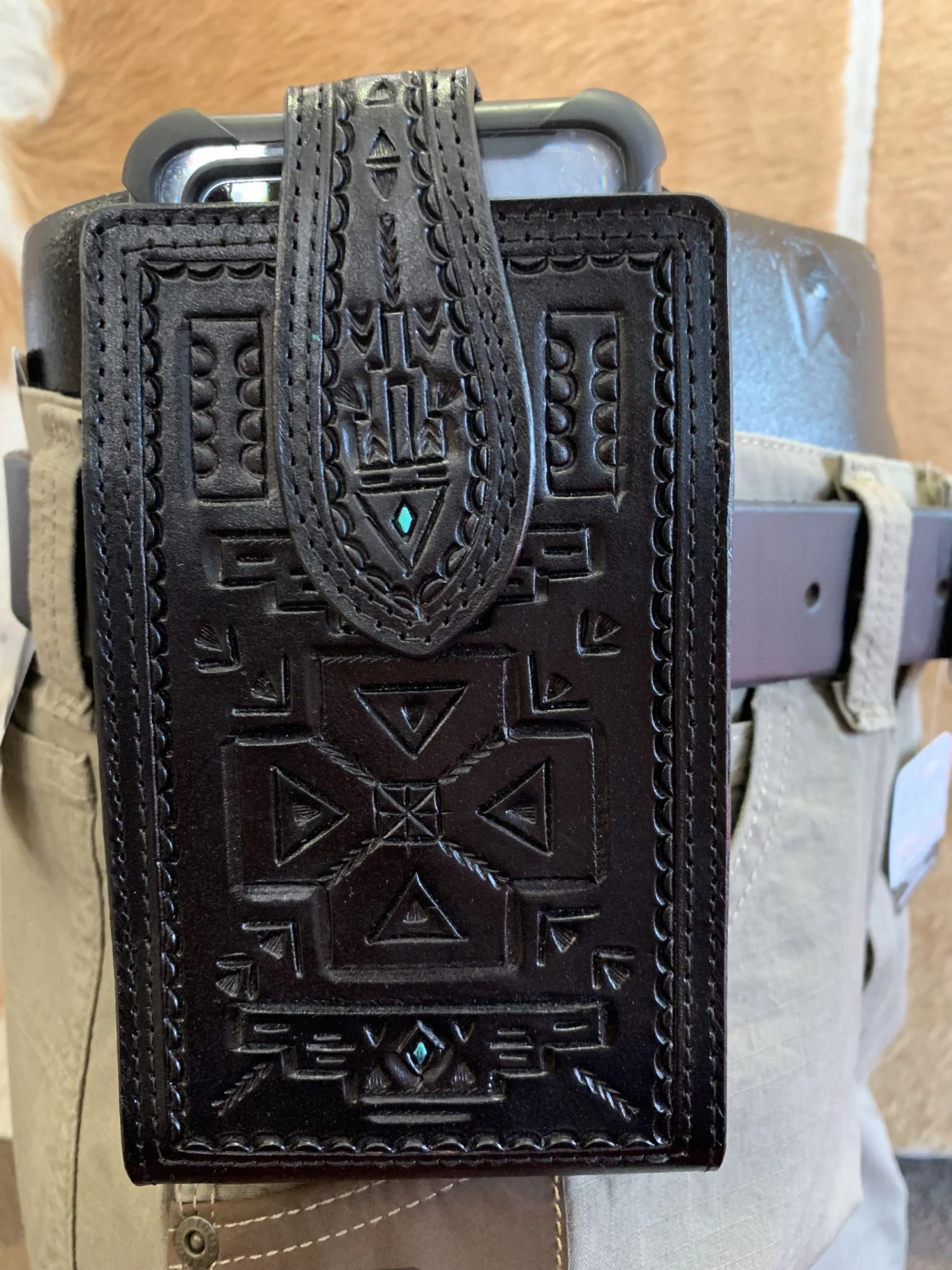 Keep your cell phone close by and protected with this leather aztec design cell phone case. This Austin Accents large phone case is black with aztec design. Double stitched edge elastic sides and a magnetic flap closure. Strong metal clip on the back. Case measures 4”W X 6 1/2″H and fits larger smartphones. With this aztec tooled design cell phone case, you will always have your cell phone close at hand.