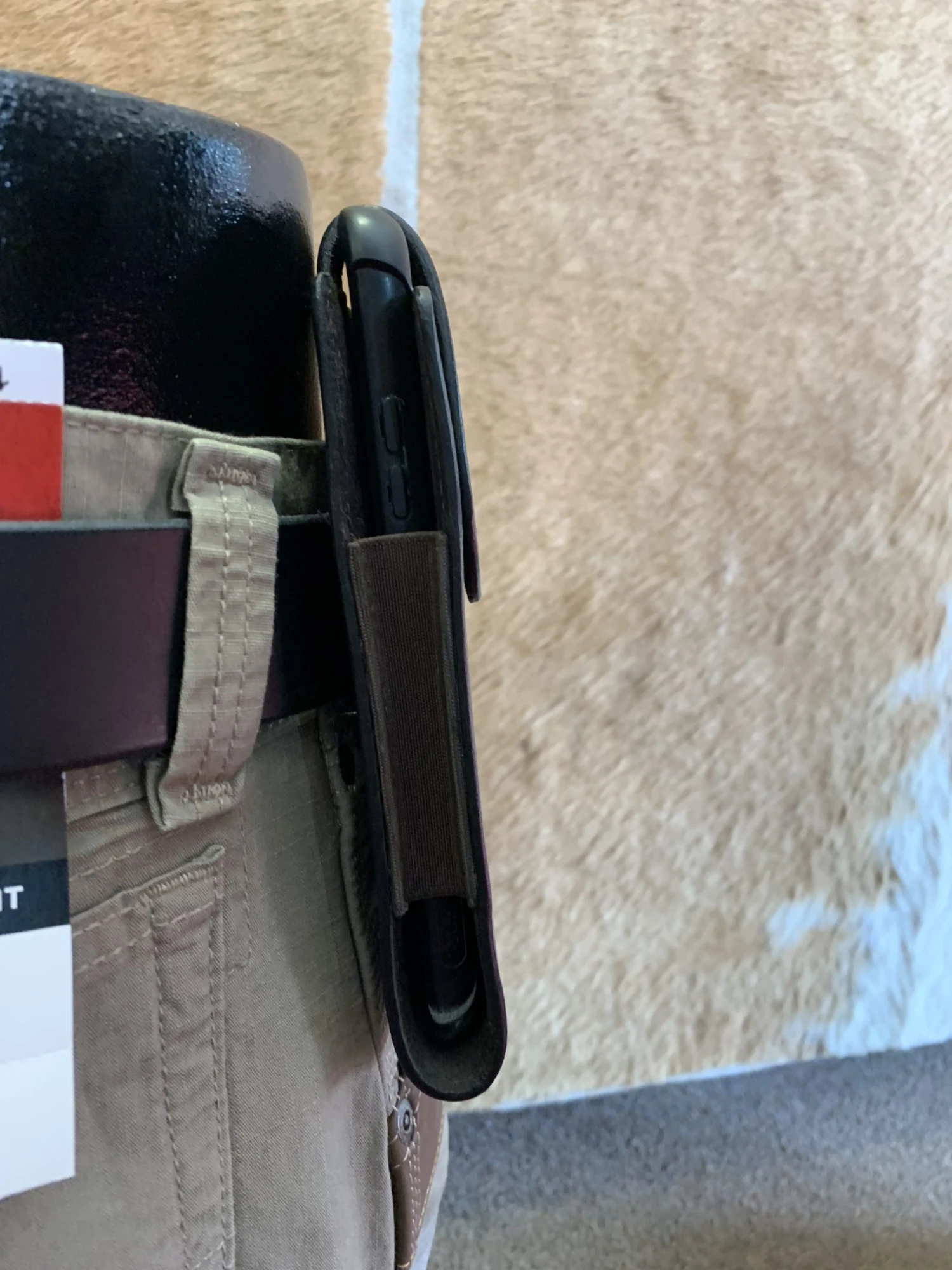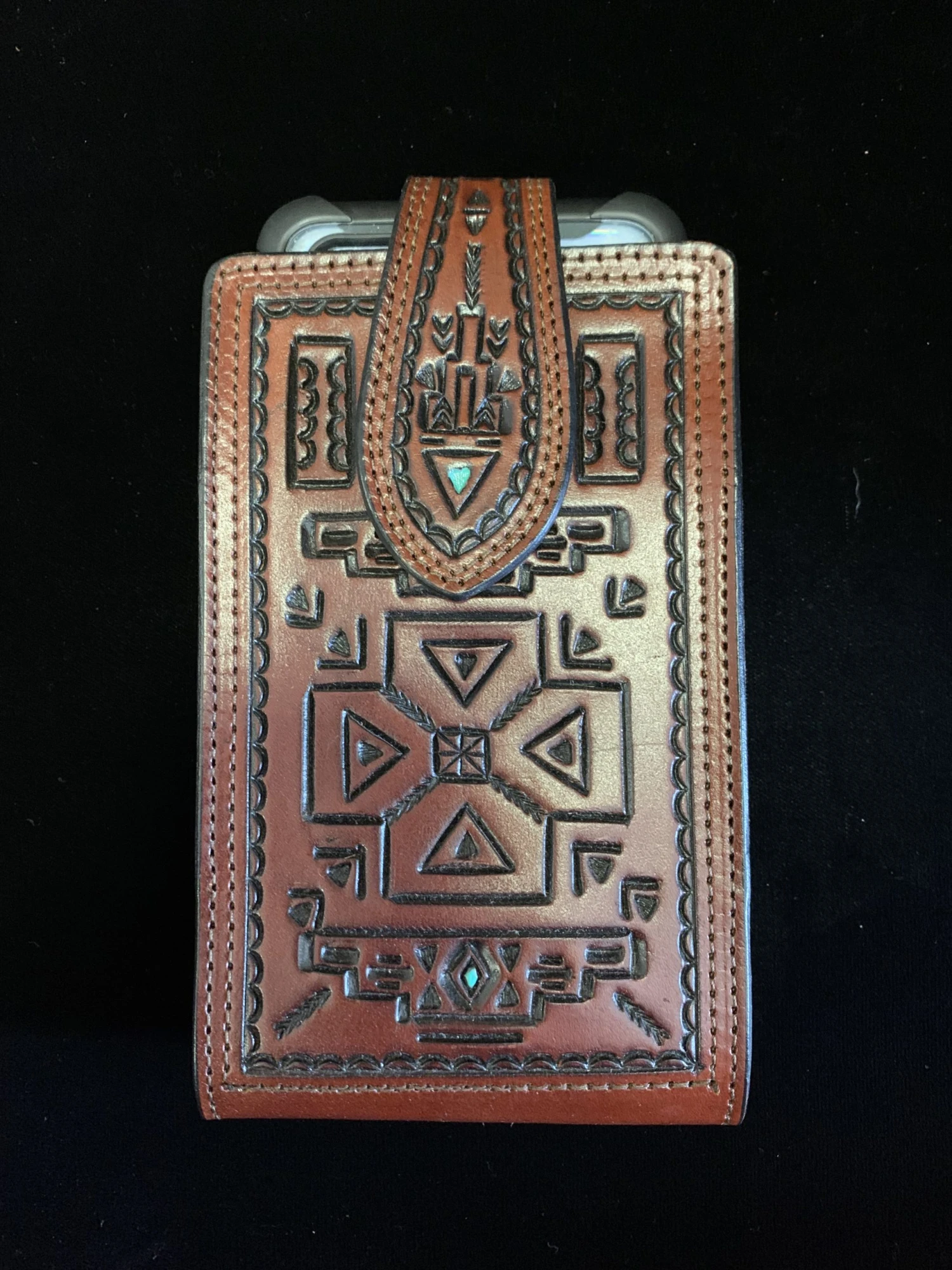 Keep your cell phone close by and protected with this leather aztec design cell phone case. This Austin Accents large phone case is brown with aztec design. Double stitched edge elastic sides and a magnetic flap closure. Strong metal clip on the back. Case measures 4”W X 6 1/2″H and fits larger smartphones. With this aztec tooled design cell phone case, you will always have your cell phone close at hand.