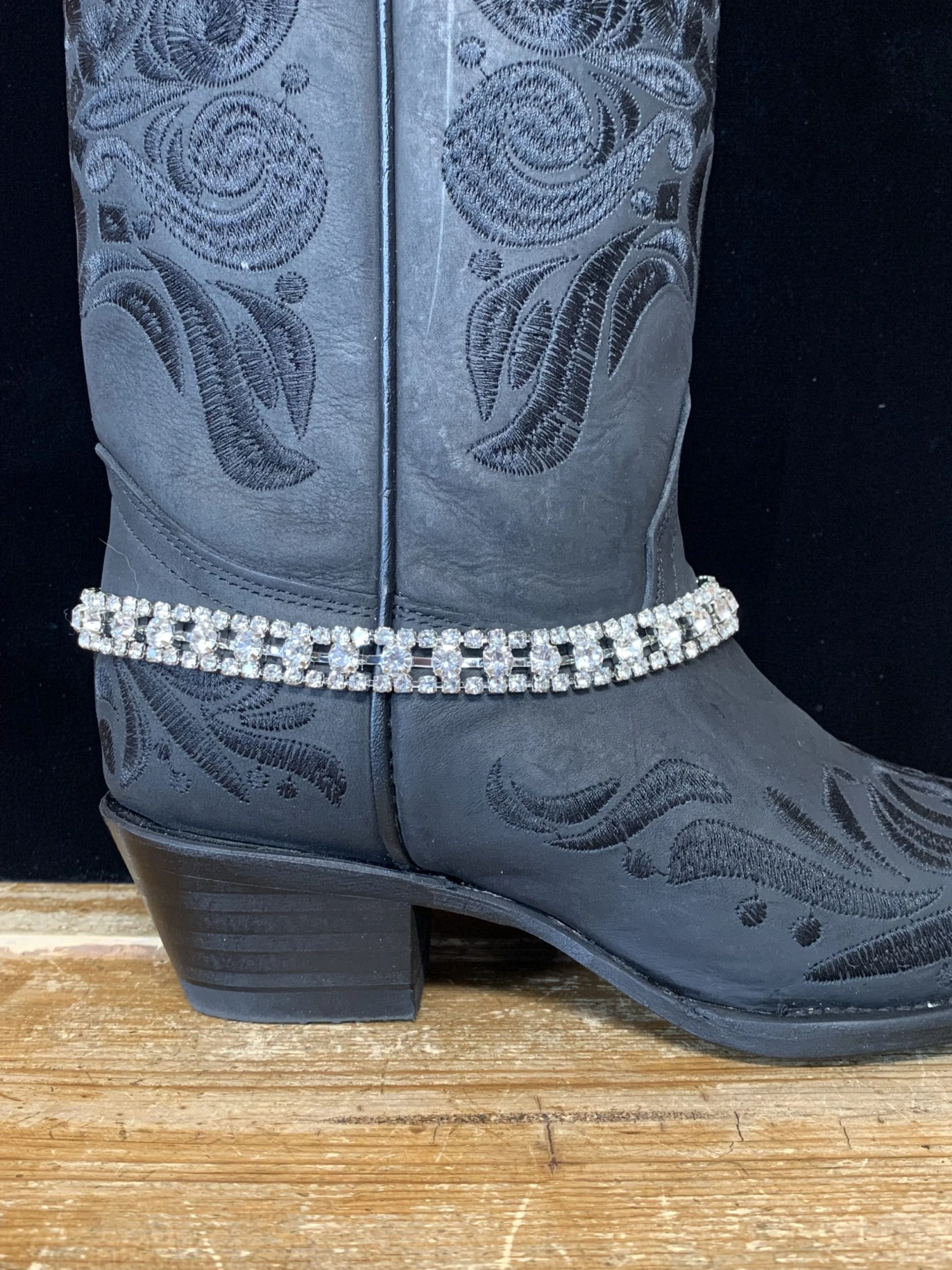 This extraordinary boot bracelet features rhinestone studded in 3 rows of gems to make your boots simply sparkle! The bracelet is fastened with ribbon clips and attaches to a stainless steel curb chain. It closes with a sturdy lobster claw clasp. This rhinestone bling that will dress up any fashion or western-style boot. Sparkly, yet elegant!