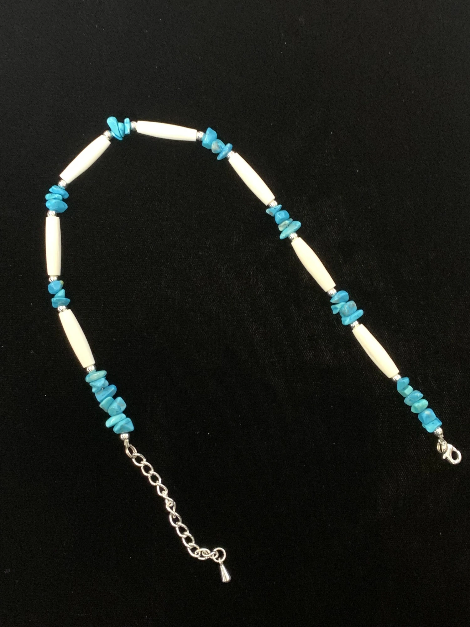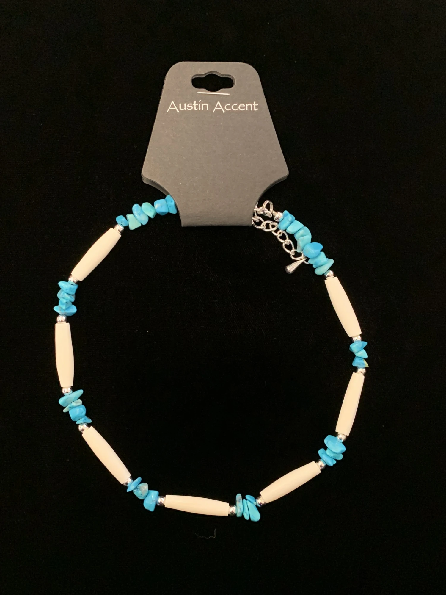 This piece features gorgeous turquoise nuggets in shades of green and teal! Strung on sterling silver wire, this Austin Accent boot bracelet is a wonderful piece, with white beads forming the perfect accent to the turquoise. Beautiful and simple boot bracelet that matches with almost any boot. Can be worn for everyday wear, to dress up an outfit, dancing, and more. Adjustable size with a lobster claw clasp. dress up any outfit with this Austin Accents turquoise and white bone boot bracelet.