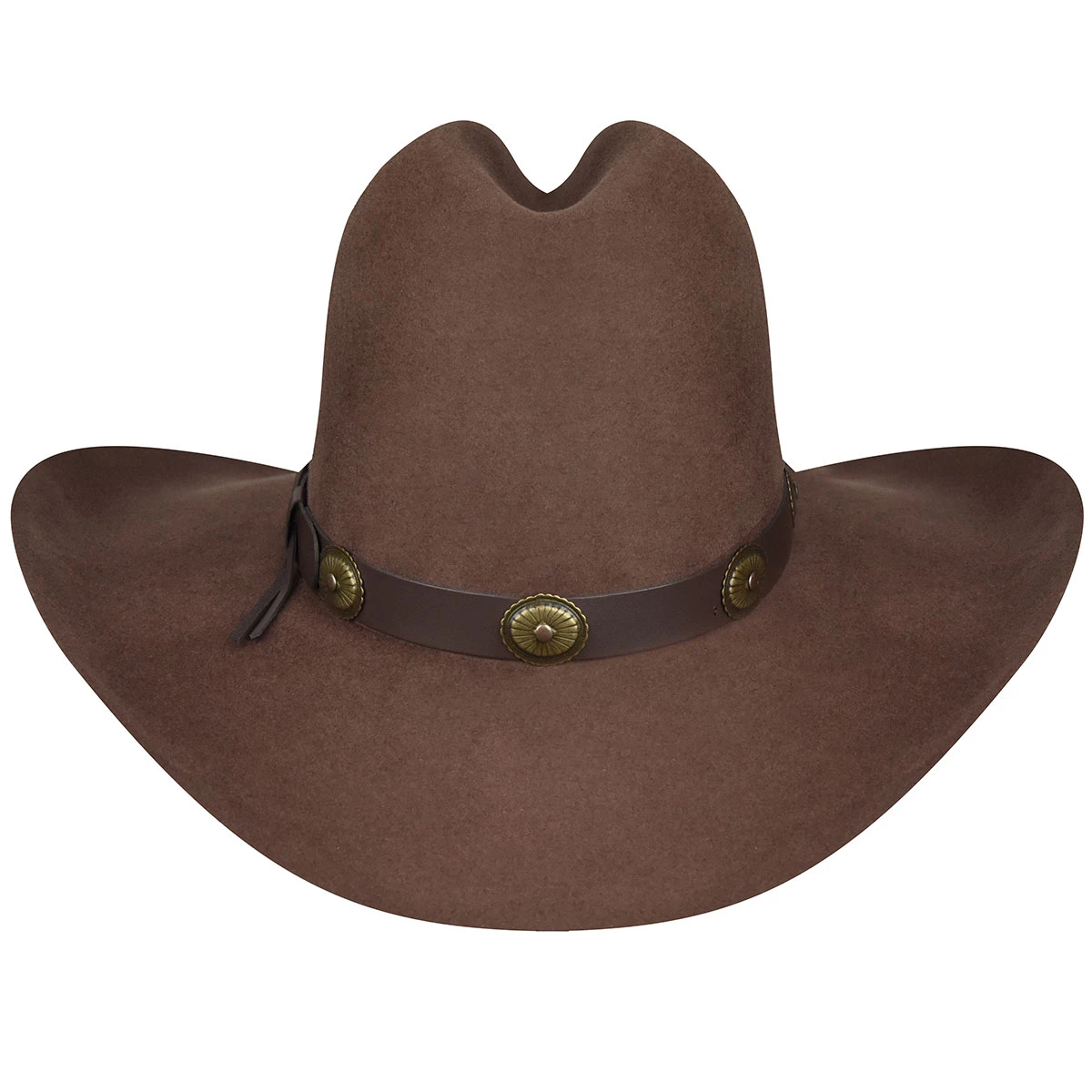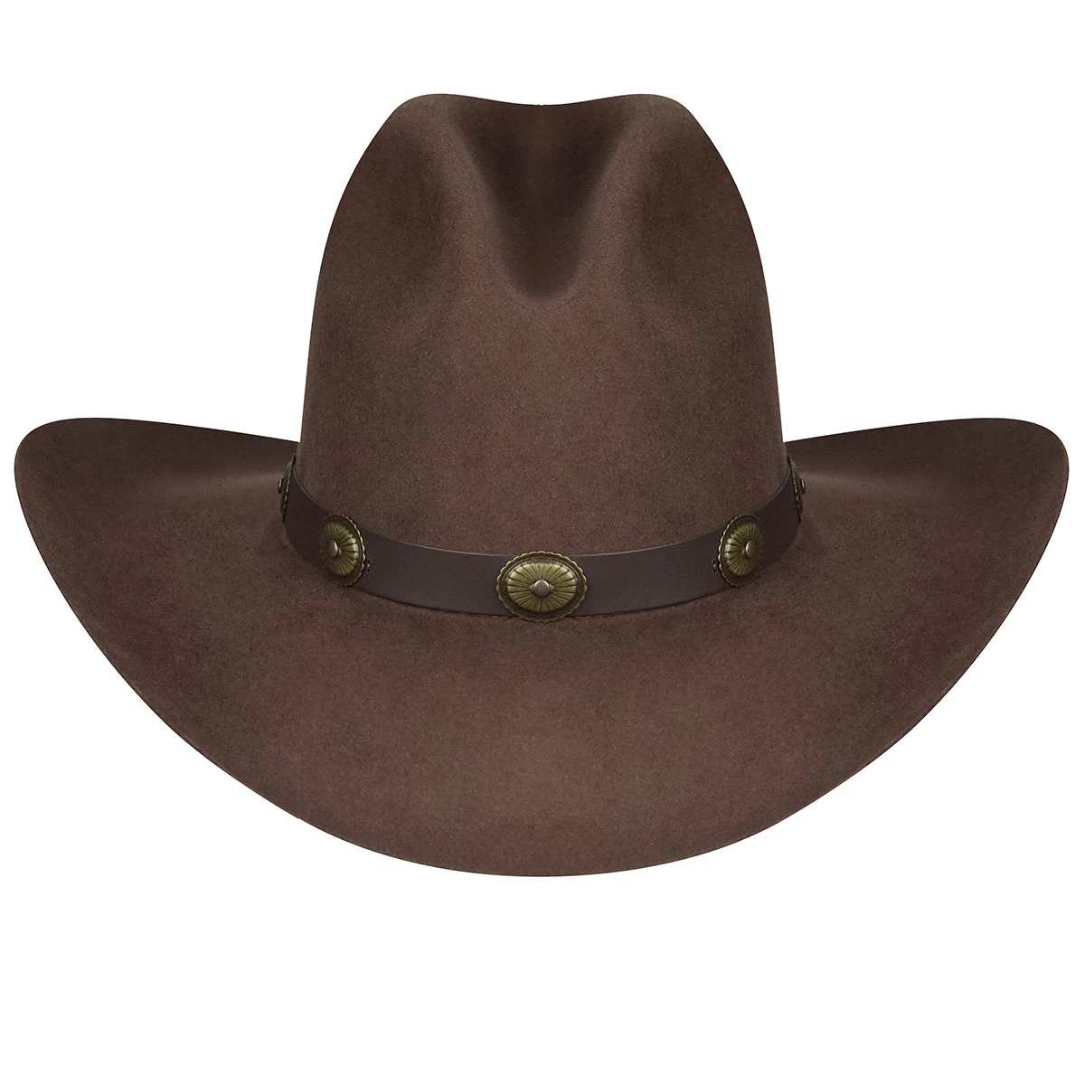 The unruly lawlessness of the Old West may be dead and gone, but you can keep that true American heritage alive with a style designed for the real cowboys of today. The Bailey Western Tombstone is made from durable 2X Wool Felt and features the famous and distinctive 4″ Gus Crown. A quality leather band with metal concho shells and tails will look great out on the range or out on the town. So saddle up and ride on out to the “Town too Tough to Die” and look your authoritative best as you tame the west.