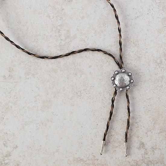 The Berry is a traditional bolo concho. It features an engraved scrollwork design in an antique silver finish. The genuine horsehair “strings” slide through an adjustable bolo back and are finished with silver metal tips. Available with either solid colored or two-toned horsehair strings. Concho diameter 1 3/4 inches. 21 inches long.