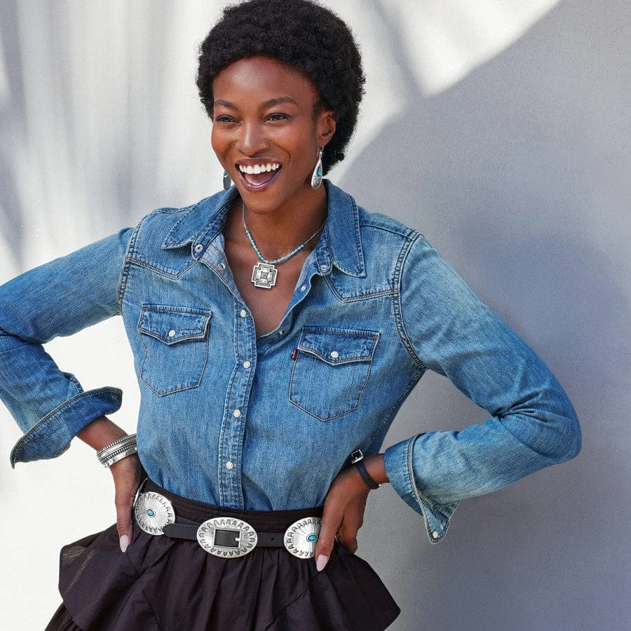 Handcrafted in Los Angeles using the finest materials sourced from around the world, this Latigo leather belt features sliding conchos with engraved filigrees and turquoise accents. With an ultra-stylish design and an elegant appeal, the Brighton Blackbird Concho Belt is enough to add a striking twist to your ensemble.