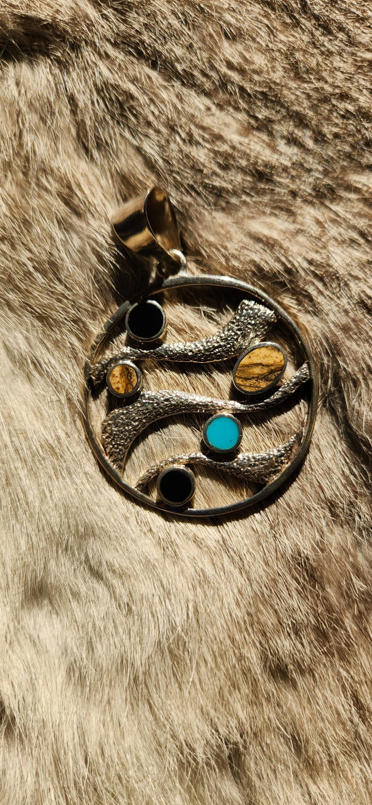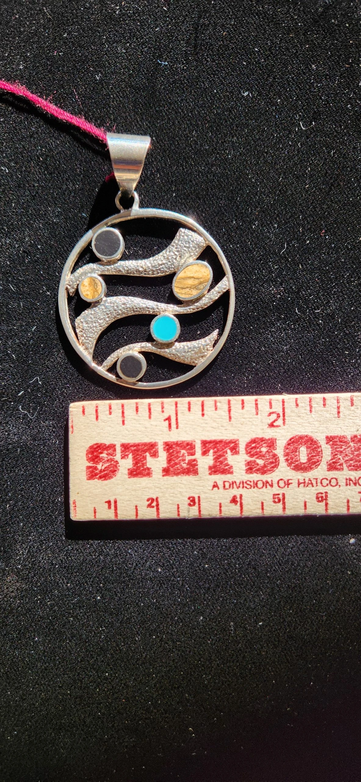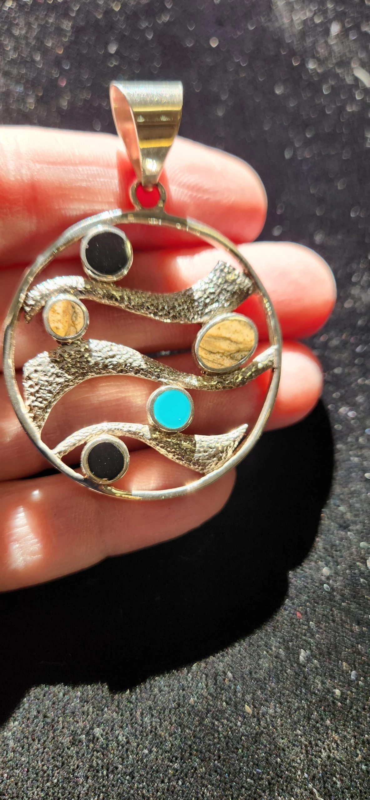 This beautiful circle wave pendant was designed by nationally renowned Designer David Rosales who is one of the finest contemporary Southwest Designers in the world today and is the founder and co-owner of Supersmiths, Inc. Hailing from Gallup, NM. David and his partner John Delgado, have taken the industry by storm with their beautiful designs.