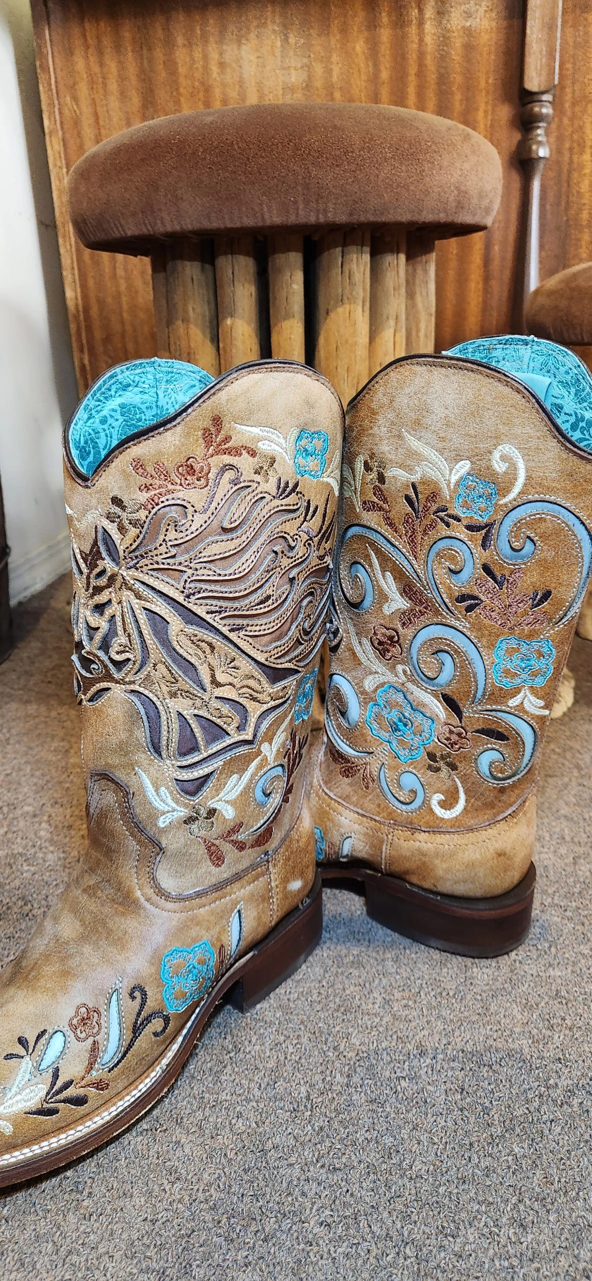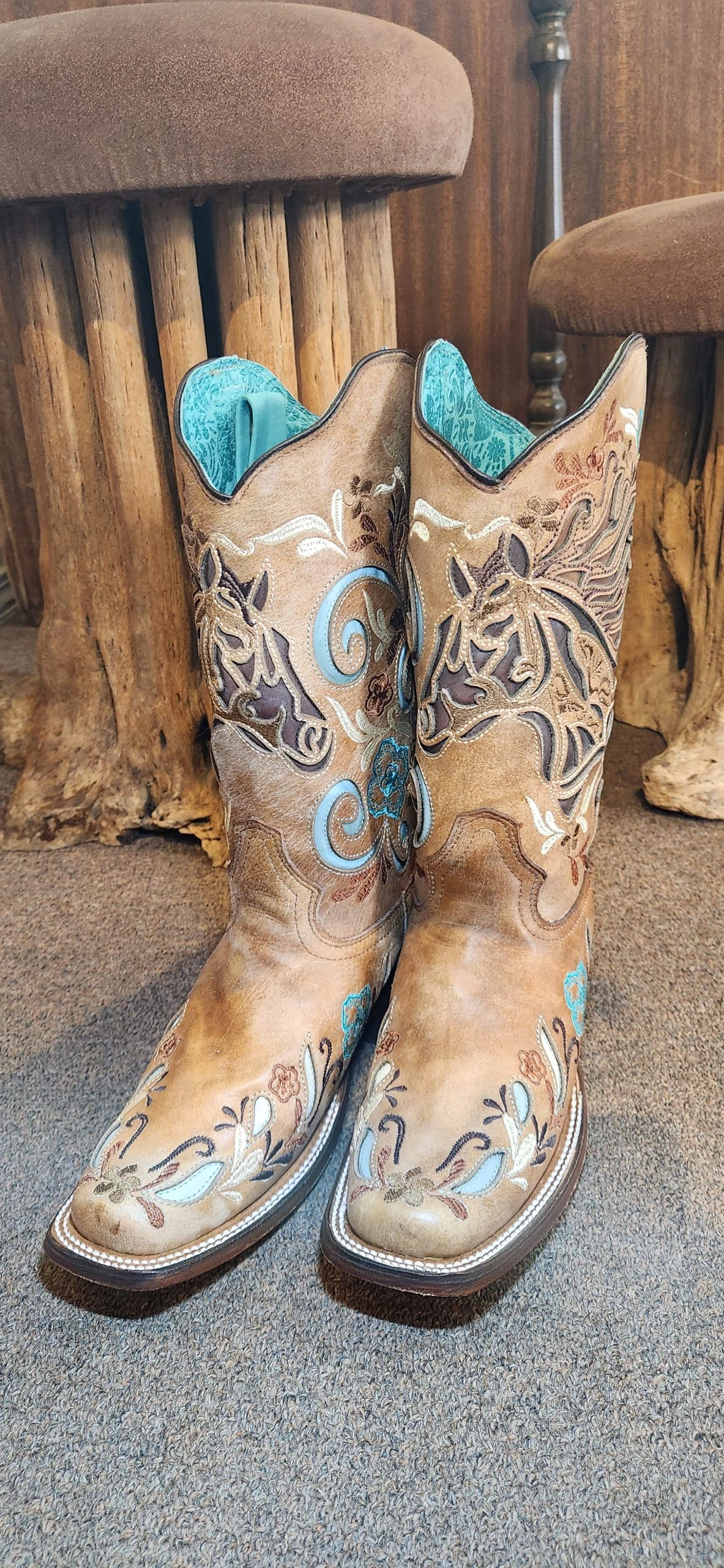 The distressed sand (tan) leather features a chocolate brown horse head inlay and is embroidered with turquoise , brown and white floral patterns. An iridescent blue inlay adds shine to this pretty cowgirl boot.
