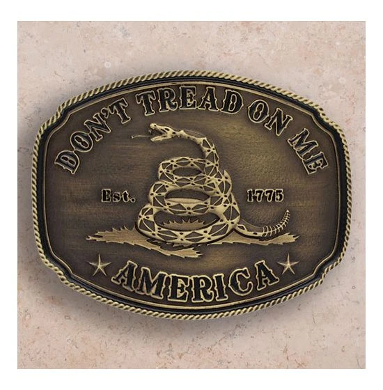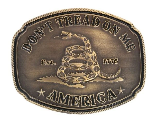 Take a piece of American Revolutionary Pride with you wherever you go. This medium sized ovalesque shaped buckle features a little slice of American heritage, with the Gadsden flag and the ‘Don’t Tread on Me’ with a rattler snake. Antiqued bronze finish with dark antiquing highlights the lifelike characteristics in this sculpted design. Standard 1.5″ belt swivel. Brass plate over a solid cast metal alloy base.