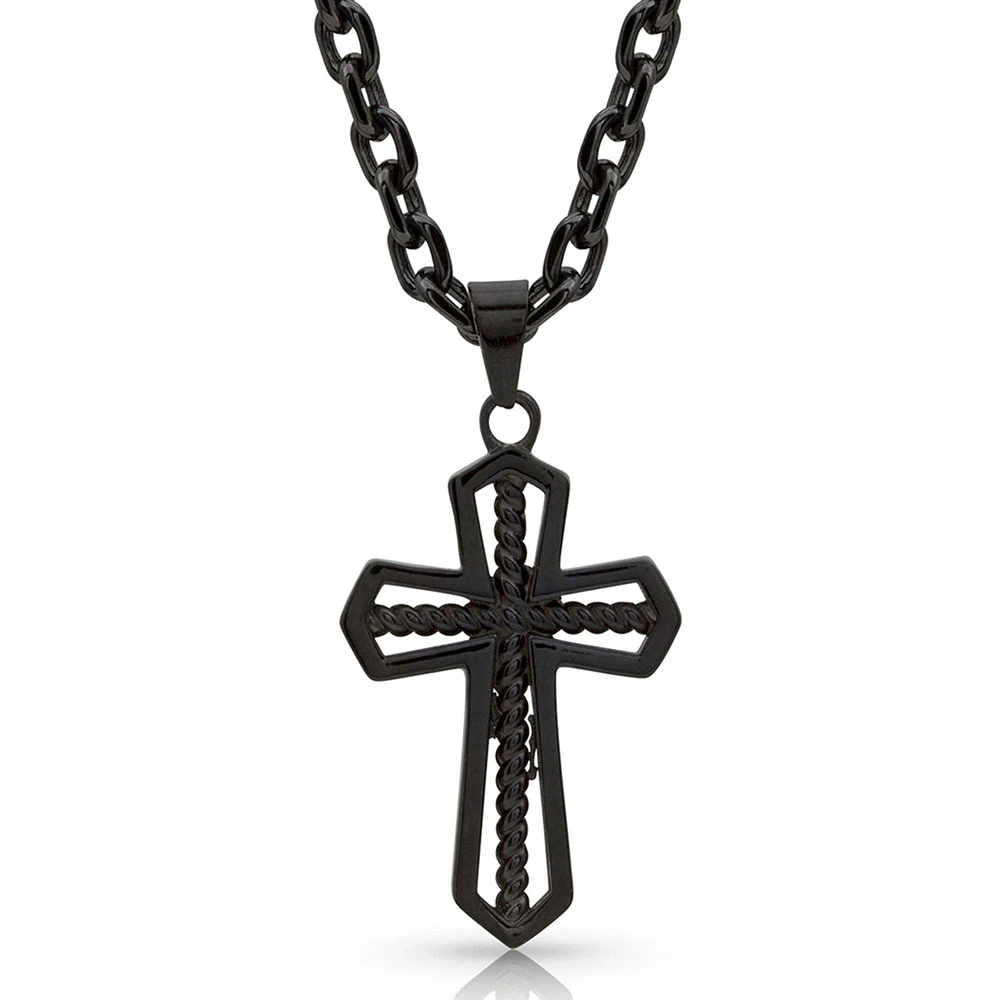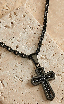 An open black colored cross pendant necklace has an interior design of black twisting rope that runs through each arm. The outside lines are a smooth line of the deep black color giving the necklace a modern, minimalist look. Necklace pendant rests on a matching chain with stations at 24, 26, and 28 inches. Made out of gunmetal plating over a steel and brass base.