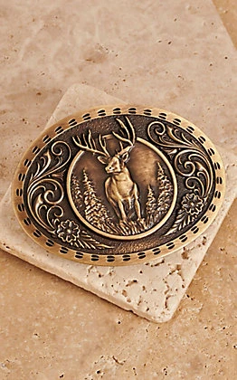 Presenting Hoss Buckles, carved from solid metal and finished in an antiqued brass based on original relief sculptures. This medium size, oval shape buckle features a wild deer standing proudly over a beautifully detailed forest landscape, framed on each side with traditional bright cut flower accents and vines. Trimmed around the edge with deer tracks. Hand finished in a heritage brass the dark antiquing highlights the lifelike characteristics in this sculpted design. Standard 1.5″ belt swivel. Made out of brass plate over a solid cast metal alloy base.