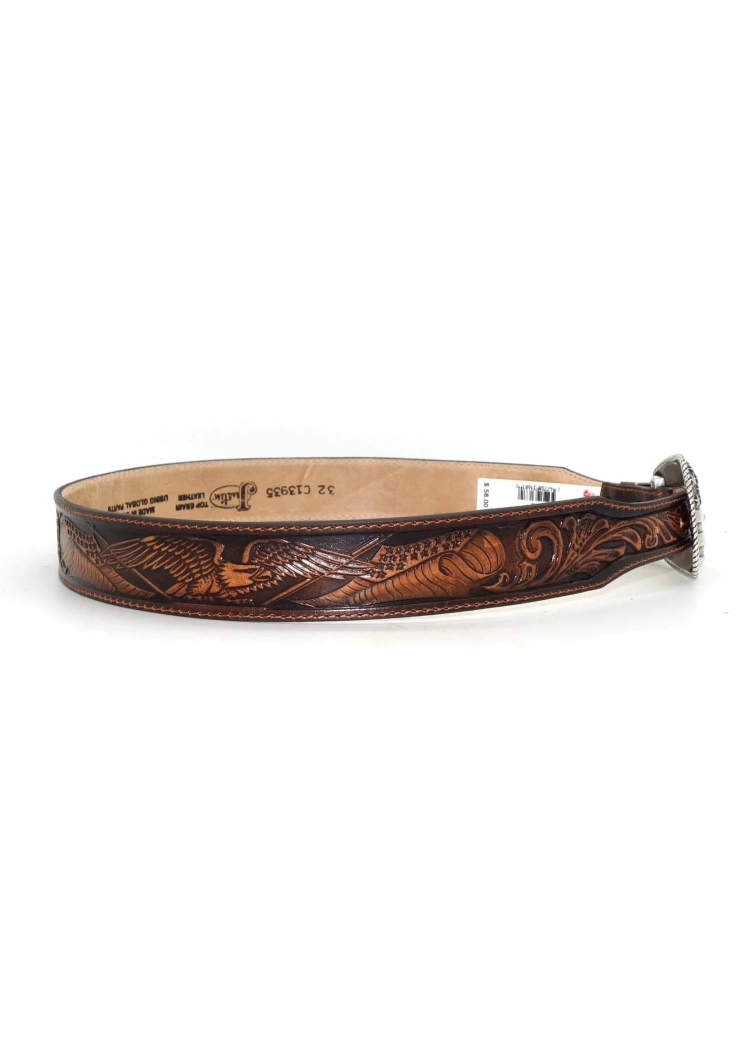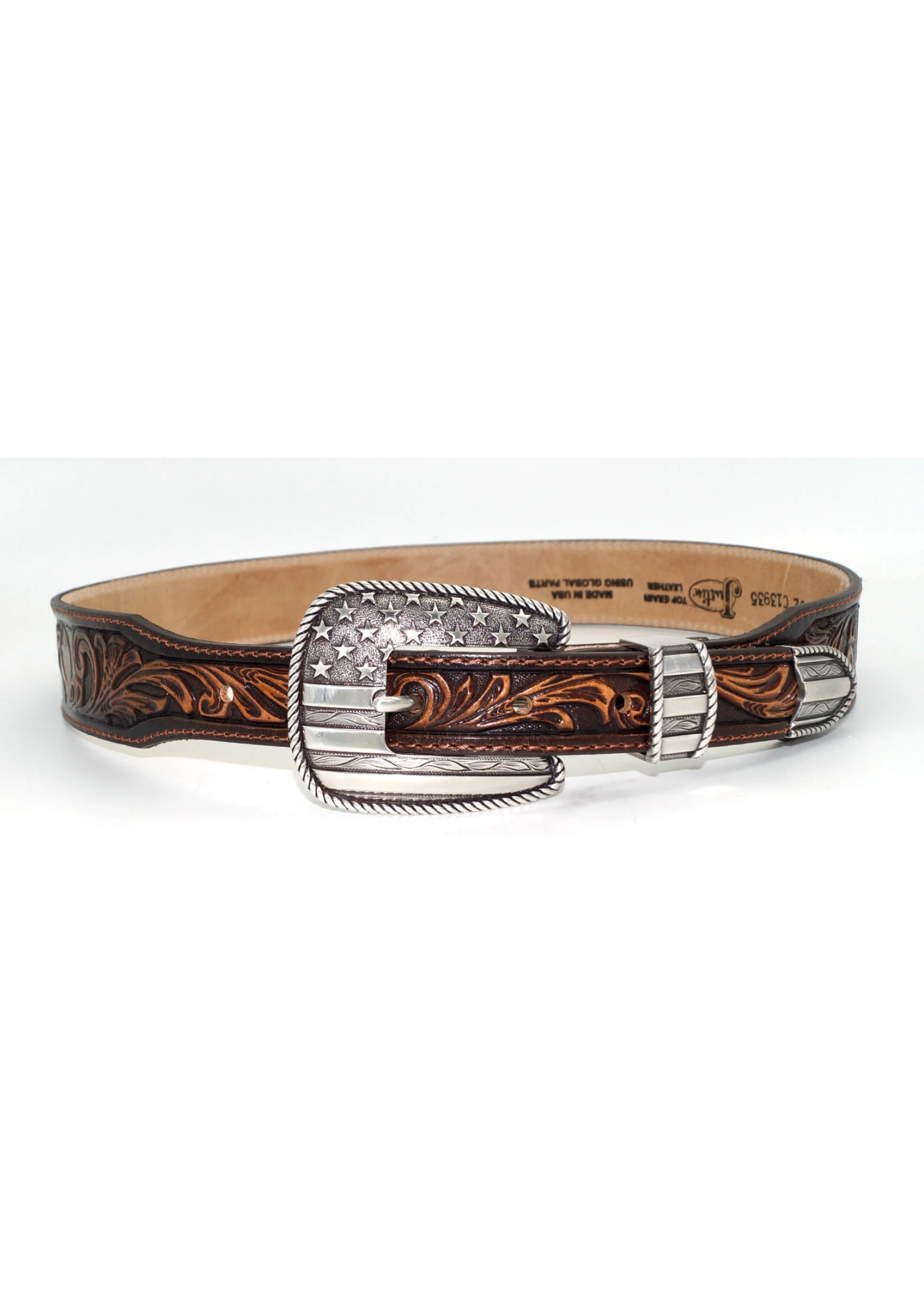 The stars and stripes forever shine on this Americana themed buckle, while the leather is embossed with traditional Western motifs. Men’s All American Belt C13935. 1 1/2″ leather strap tapered to 1″ embossed with flag and eagles in shades of brown. The stars and stripes forever shine on this Americana themed buckle, keeper and tip.
