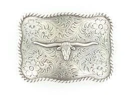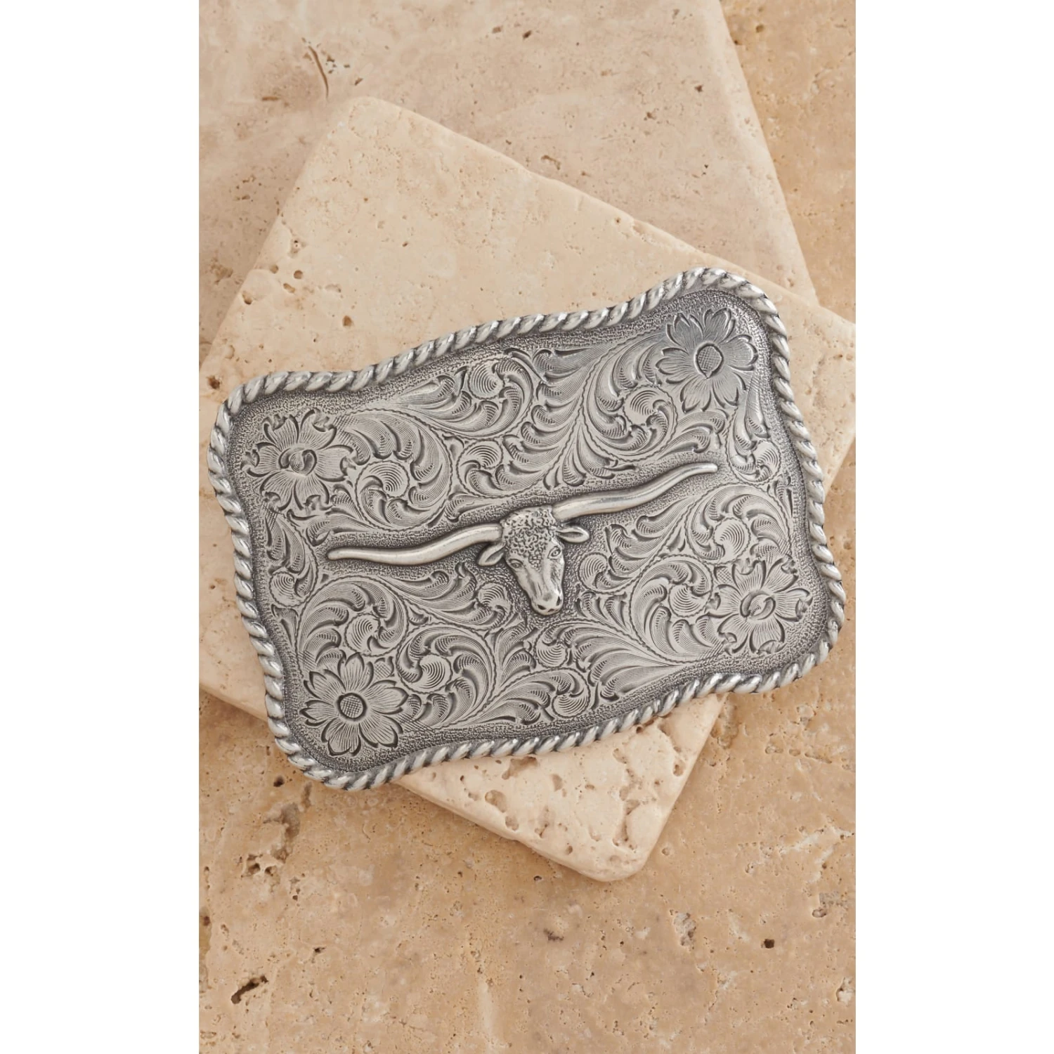 This M&F Western Nocona buckle is a scalloped rectangular buckle trimmed with rope edging. Floral background etched into the antiqued silver with longhorn head in center. For a classic touch of Western style, the Antiqued Longhorn Buckle by M&F Western will fit the bill. Silver-tone metal buckle embossed with a large steer head image.