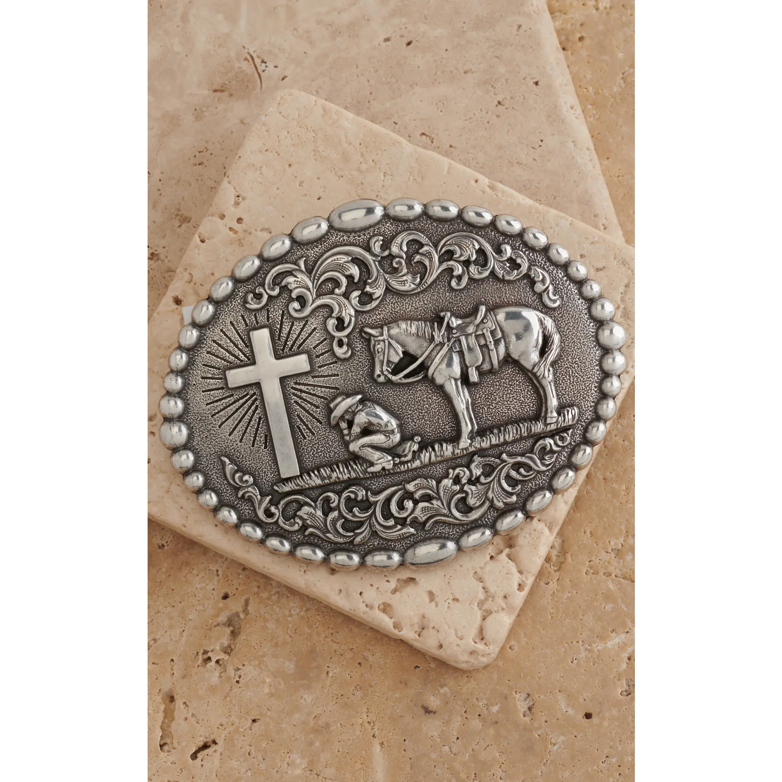 This silver oval buckle by Nocona has a large and small berry edge with a cowboy kneeling with his horse praying at the cross with also a raised floral design. This is a very nice belt buckle that fits most size belts and has your traditional belt loop fastener that is easy to slide on and off. This buckle is made to shine up your outfit! Put this on your favorite leather belt and you will be ready to make your best impression.