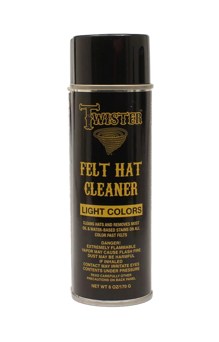 Twister Scout Felt Hat Cleaner is specifically designed to clean light felt and beaver hats. Directions: Brush hat thoroughly to remove loose dirt ad other items. Make sure hat is color-fast by spraying hidden area and checking for any undesirable effects. if color rubs off, it’s not colorfast and should not be treated.
