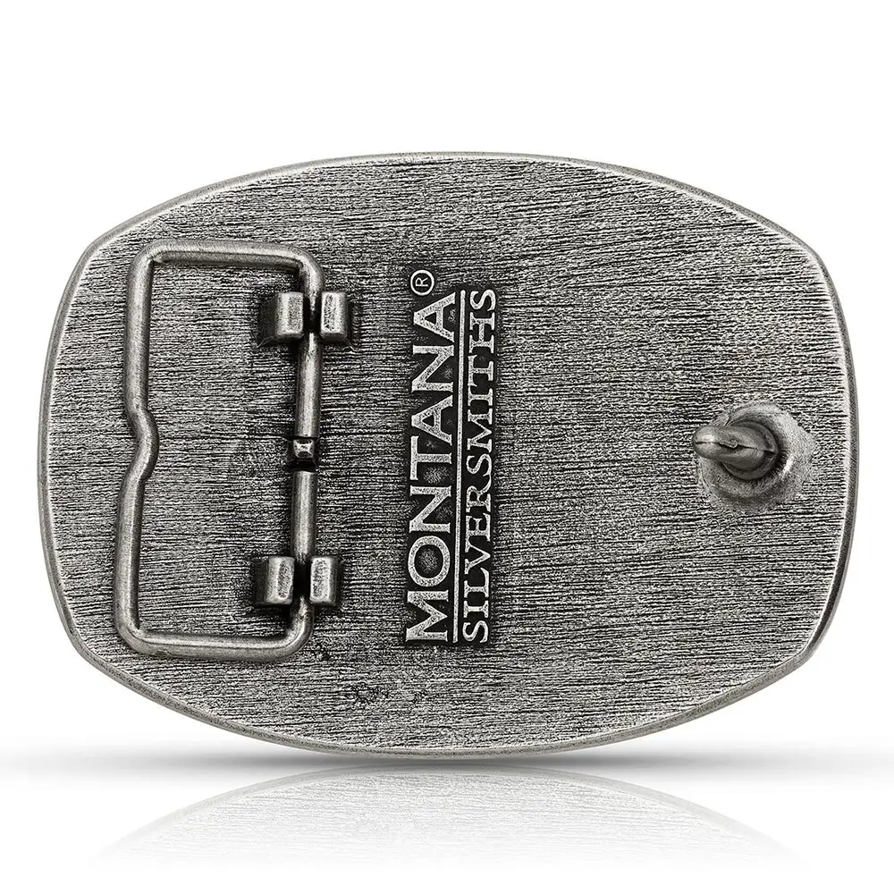 An antiqued silver tone cast buckle with a male and female pair of deer figures standing at attention in the midst of a grassy field. The stars-n-stripes serve as a patriotic backdrop to the matched animals. The buckle is finished with a smooth wire notched edge with the notches filled with beads. Standard 1.5 inch belt swivel. Made out of silver plate over a solid cast white metal alloy base. Montana Armor® protective finish to prevent tarnish. Paint