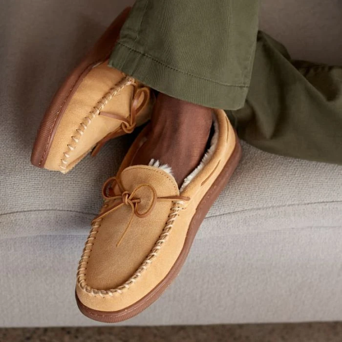 Say goodbye to cold feet! Minnetonka genuine sheepskin moccasins feature warm, luxurious pile lining. Padded foam insoles for extra comfort. Tie front with 360 degree lacing for a better fit. With a traditional moccasin design and specially constructed indoor-outdoor soles, these slippers are for more than just the house. Ideal for walking the dog or grabbing coffee, these moccasin slippers will keep your feet warm on chilly days. Thick pile lining cushions every step and supple suede gives these slippers a rich look and feel.