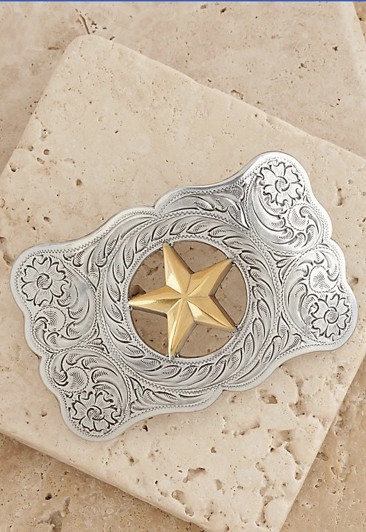 Gold star cut out in center which offers the latest in cowboy fashion. Boxed for easy gift giving. Let your Western style stand out with the Star Buckle by M&F Western. Silver and gold-tone metal buckle embossed with a large Texas star design.