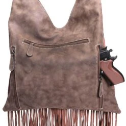 This conceal carry shoulder bag by M&F Western Products is from the Norma collection. It is black with tan side panels and black fringe. Floral tooled strap with ivory flowers and silver studs From the Norma collection, this concealed carry shoulder bag has a zip closure pocket for your gun.
