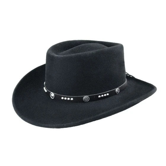 This hat will make you feel like a true renegade running the poker tables of your local saloon. Crafted from Litefelt® so its shape retentive, water repellent and crushable, the Joker has a 4″ telescope crown and 3 1/8″ brim. It has a black leather band with studs and conchos sporting deck of cards symbols in the center. Proudly made in the USA. The Joker is a round oval Telescope crown. This hat is a black Litefelt telescope crown hat. It has a black leather band with studs and conchos sporting deck of cards symbols in the center.