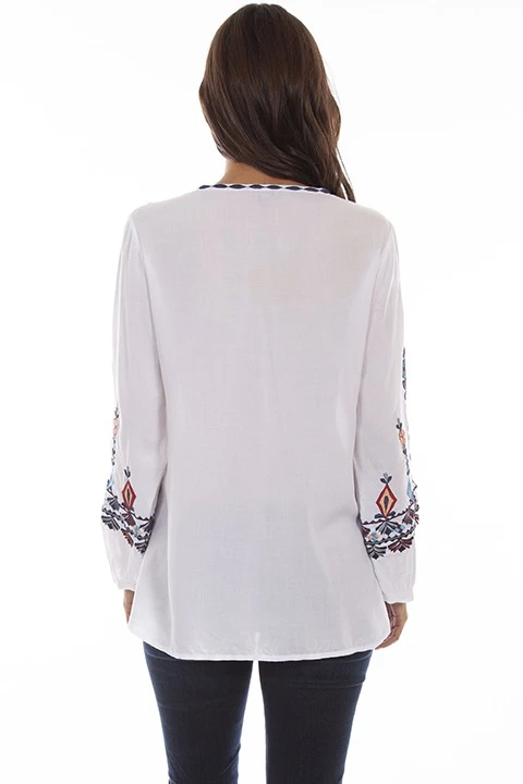 Light as a cloud, this flirty summer blouse features an embroidered bodice with v neck tie front. The long sleeves sport embroidered detailing from the elbow to the cuff. Needing a light summer shirt? This white shirt is incredibly light weight and flowy. It can be a staple of your wardrobe this summer for concerts or rodeos! For the best leather accessories, leather goods, and fine western clothing, look no further than Scully Leather. These high quality goods are crafted from the finest materials available.