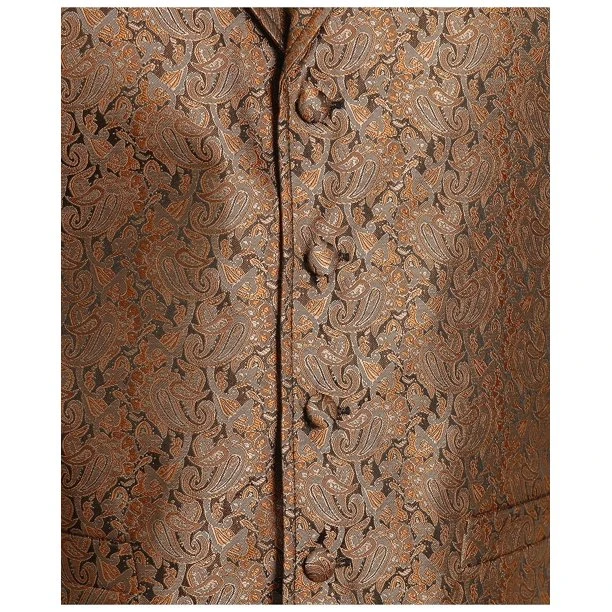 This Brown Paisley Vest Is A Touch Of The Old West And Is Sure To Please. It Is Fashioned With Notched Lapels, Covered Buttons, Two Welt Pockets And An Adjustable Strap On Back. Fully Lined. Dry Clean Only. Big And Tall Sizes Available.