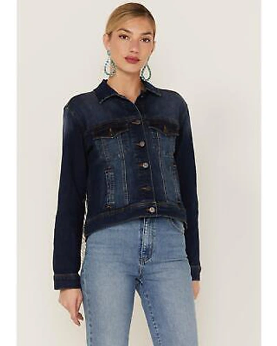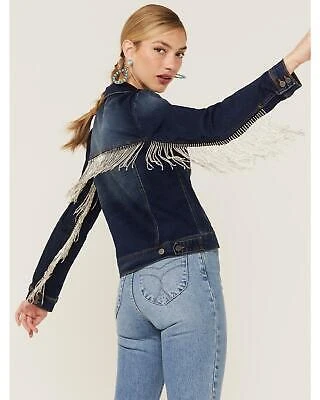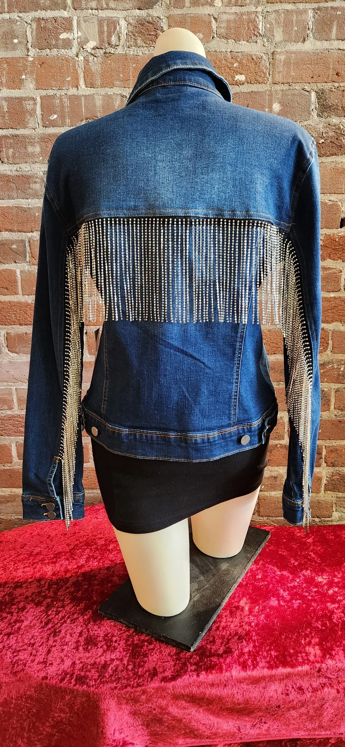 Denim jacket with fringe. This denim jean jacket goes to new heights with this flashy rhinestone fringe throughout. It features a metallic button front, point collar and two chest flap pockets with button closures. The rhinestone fringe is on the sleeves and back. Dry clean only.