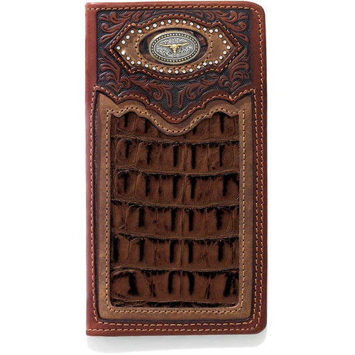 Of all the money toting, card carrying contraptions out there, this is the undisputed king of the herd! Only a true cowboy would carry this handsome checkbook wallet. Show your cowboy credentials with a rugged-as-ever checkbook wallet. Silver Creek – Genuine top grain leather – Slim fit design – Outstanding features – Lasting Quality. This leather checkbook wallet features a unique tooling pattern along with a western concho. It holds up to 6 cards and has an ID window.