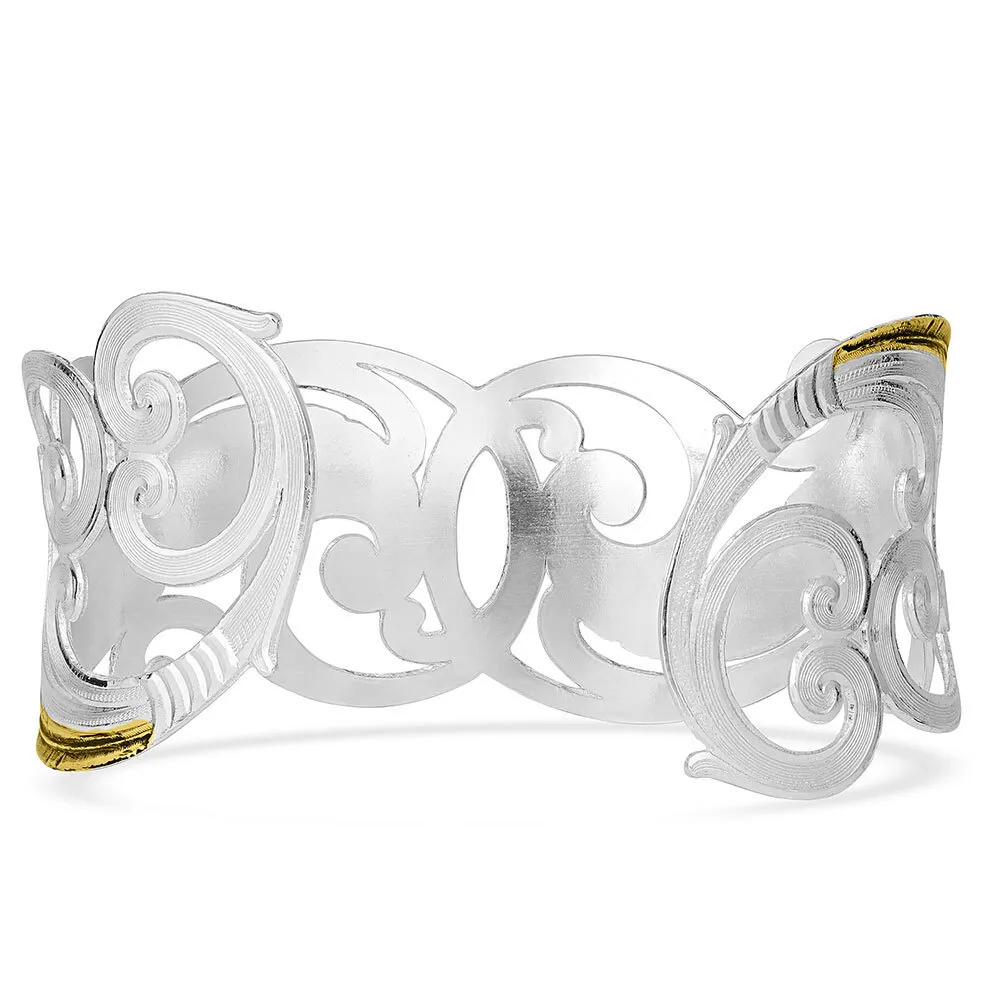 Complete your outfit with beauty inspired by the blazing sun by wearing the Montana Silversmiths® Sunfire Filigree Cuff Bracelet. It showcases gold-tone, curving feathers woven within silver-tone, swirling filigrees for bright style that’ll instantly elevate any look! Crafted from brass with 99.9% fine-silver and 24K gold plating. A Montana Armor protective coating resists tarnishing for long-lasting shine.
