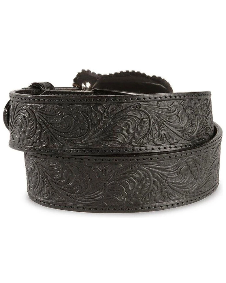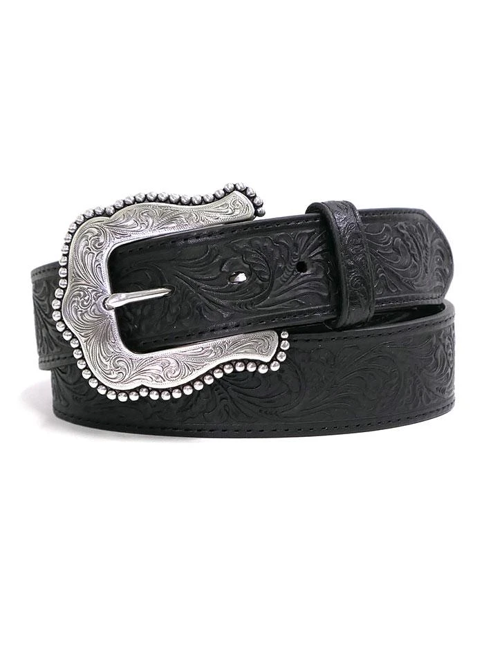 Complete your outfit with this Tooled Leather black Layla belt by Tony Lama. This belt is made with quality leather and is enhanced with floral tooling. The silver-tone filigree engraved buckle is trimmed with studded edges to match. The buckle and keeper are removable if you want to personalize your look, making this belt a must-have!