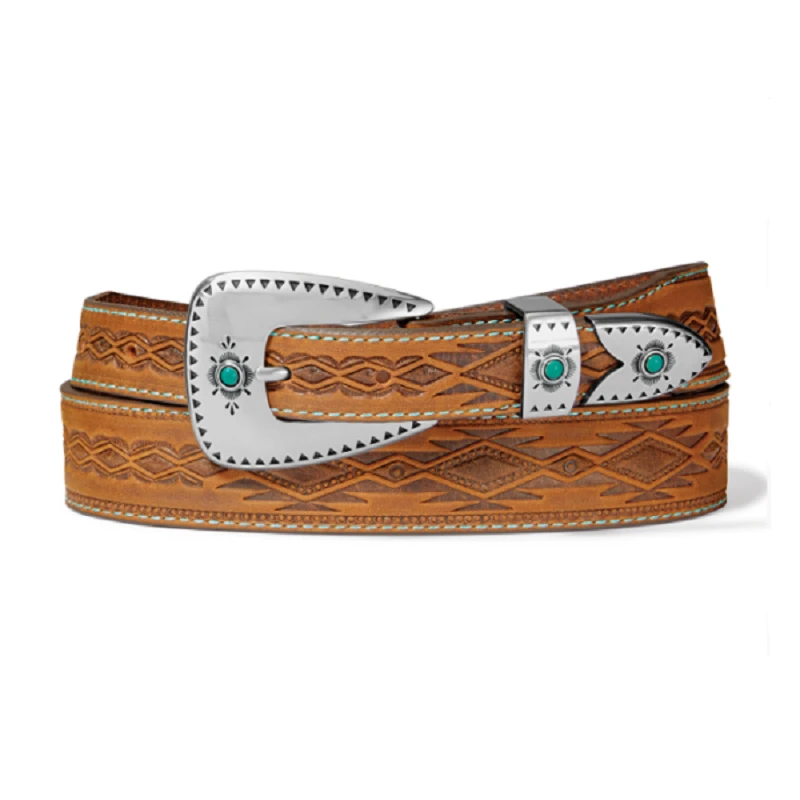 Dakota Belt C51299 Women’s Southwestern Embossed Western Belt Brown – A Southwestern motif is embossed into vegetable tanned leather by our LA artisans. The 3-piece buckle on the belt features hand-set stones.