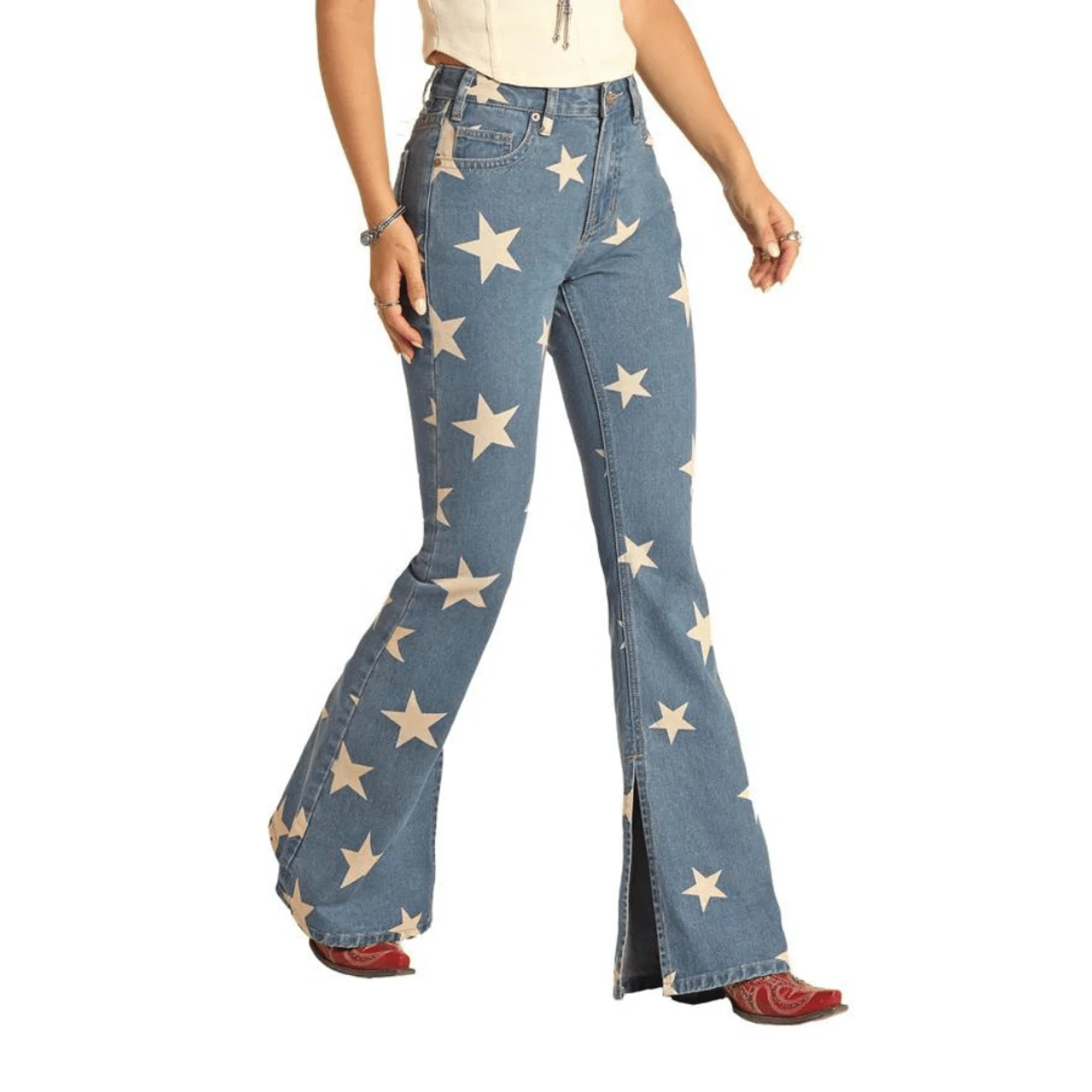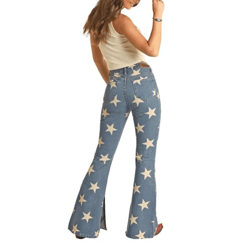 Stand out in a crowd as a star with these Panhandle Slim star covered ladies star high rise denim jeans! Perfect for pairing with trendy cropped tops or Tees to show your curves and flatters your body. Amazing full length jeans that hug every curve perfectly. The bottom is a wide leg flare that is a relaxed fit.