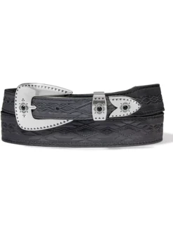 Dakota Belt C51293 Womens Southwestern Embossed Western Belt Black – A Southwestern motif is embossed into vegetable tanned leather by our LA artisans. The 3-piece buckle on the belt features hand-set stones.